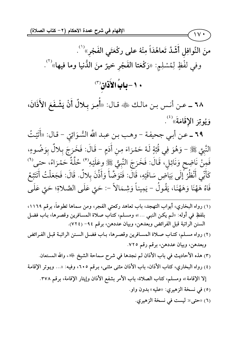 (¬3) هذه الأحاديث في باب الأذان لم نجدها في شرح سماحة الشيخ - رحمه الله -، واللَّه المستعان.