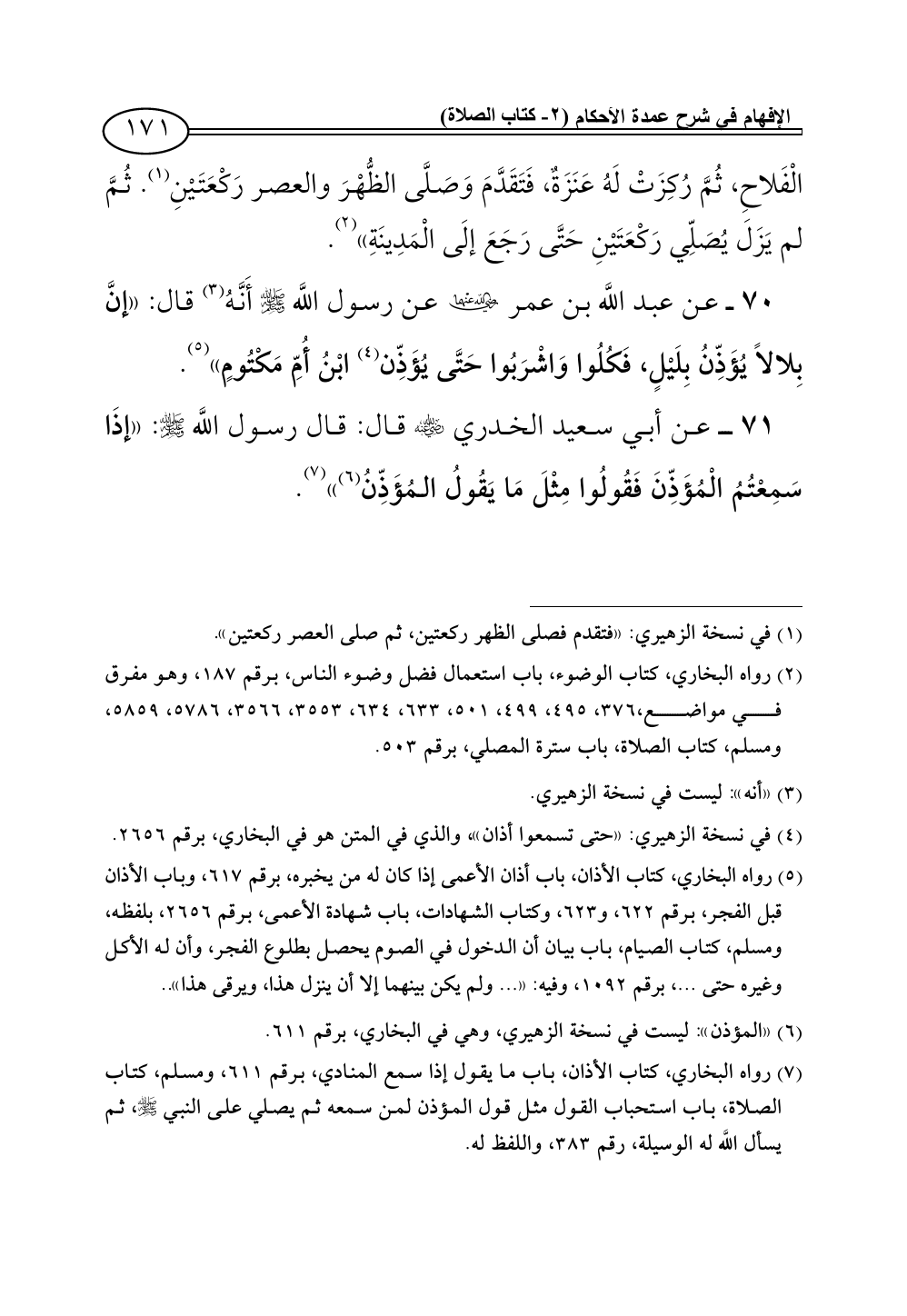 (¬6) «المؤذن»: ليست في نسخة الزهيري، وهي في البخاري، برقم 611.