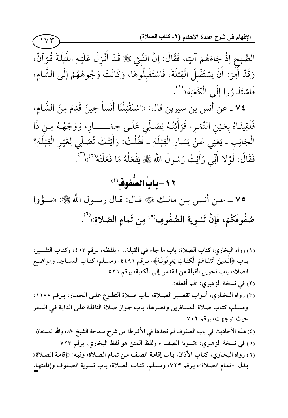 75 - عن أنس بن مالك - رضي الله عنه - قال: قال رسول اللَّه - صلى الله عليه وسلم -: «سَوُّوا صُفُوفَكُمْ، فَإِنَّ تَسْوِيَةَ الصُّفُوفِ (¬5) مِنِ تَمَامِ الصَّلاةِ» (¬6).