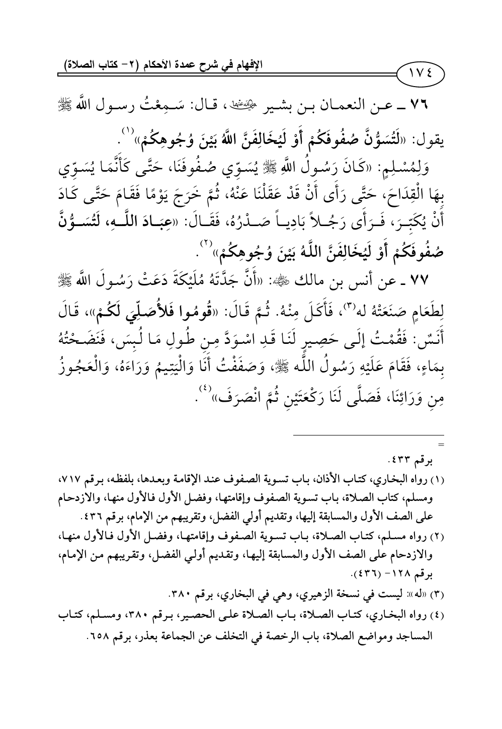 76 - عن النعمان بن بشير - رضي الله عنهما -، قال: سَمِعْتُ رسول اللَّه - صلى الله عليه وسلم - يقول: «لَتُسَوُّنَّ صُفُوفَكُمْ أَوْ لَيُخَالِفَنَّ اللَّهُ بَيْنَ وُجُوهِكُمْ» (¬1).