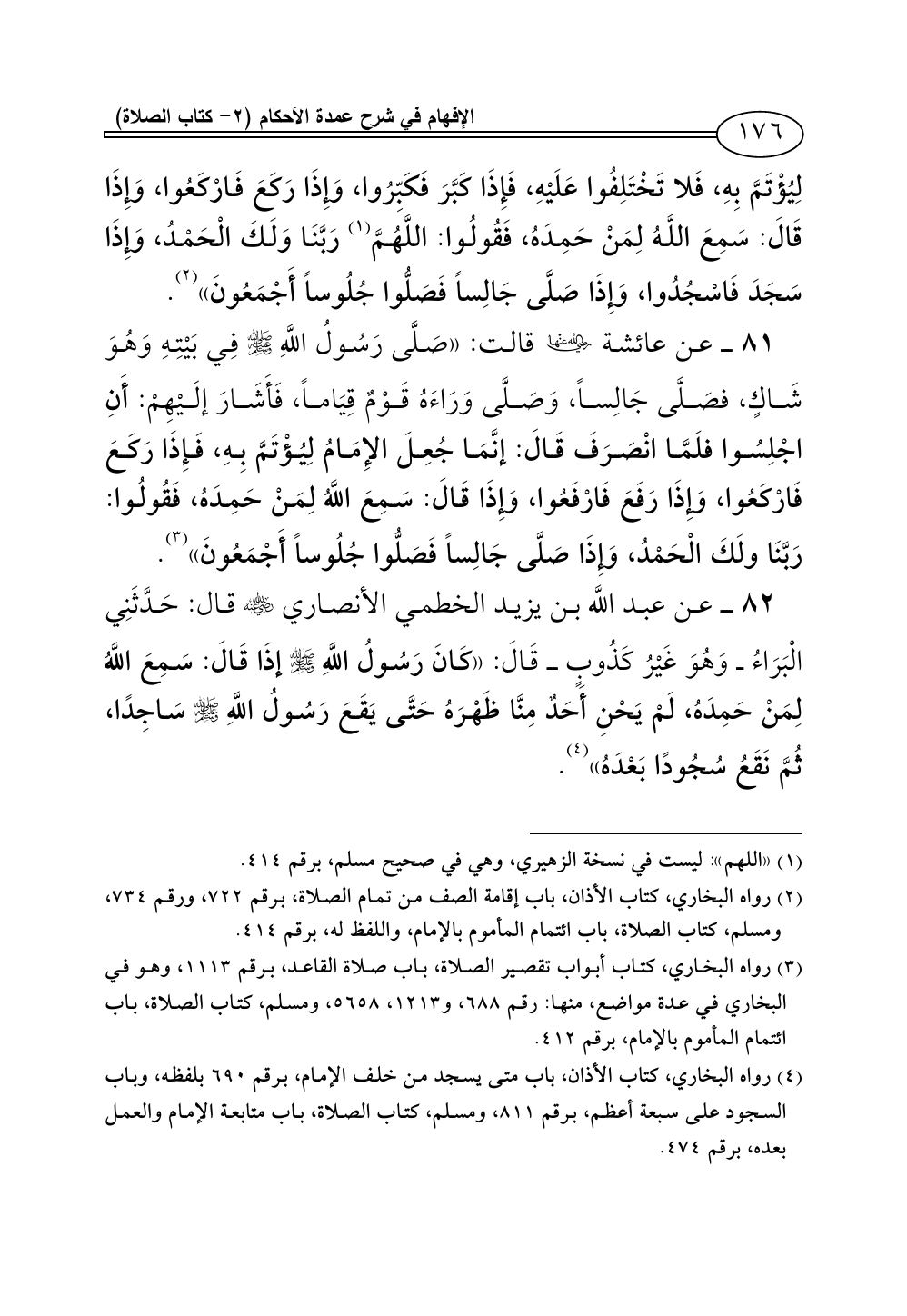 81 - عن عائشة - رضي الله عنها - قالت: «صَلَّى رَسُولُ اللَّهِ - صلى الله عليه وسلم - فِي بَيْتِهِ وَهُوَ شَاكٍ، فصَلَّى جَالِساً، وَصَلَّى وَرَاءَهُ قَوْمٌ قِيَاماً، فَأَشَارَ إلَيْهِمْ: أَنِ اجْلِسُوا فلَمَّا انْصَرَفَ قَالَ: إنَّمَا جُعِلَ الإِمَامُ لِيُؤْتَمَّ بِهِ، فَإِذَا رَكَعَ فَارْكَعُوا، وَإِذَا رَفَعَ فَارْفَعُوا، وَإِذَا قَالَ: سَمِعَ اللَّهُ لِمَنْ حَمِدَهُ، فَقُولُوا: رَبَّنَا ولَكَ الْحَمْدُ، وَإِذَا صَلَّى جَالِساً فَصَلُّوا جُلُوساً أَجْمَعُونَ» (¬3).