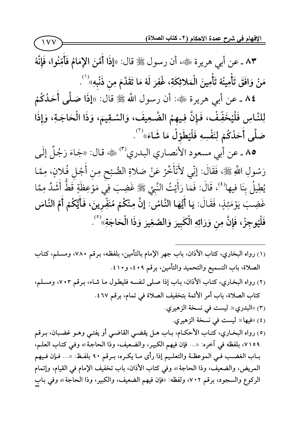 (¬5) رواه البخاري، كتاب الأحكام، باب هل يقضي القاضي أو يفتي وهو غضبان، برقم 7159، بلفظه في آخره: «... فإن فيهم الكبير، والضعيف، وذا الحاجة»، وفي كتاب العلم، باب الغضب في الموعظة والتعليم إذا رأى ما يكره، برقم 90 بلفظ: «.... فإن فيهم المريض، والضعيف، وذا الحاجة»، وفي كتاب الأذان، باب تخفيف الإمام في القيام، وإتمام الركوع والسجود، برقم 702، ولفظه: «فإن فيهم الضعيف، والكبير، وذا الحاجة»، وفي باب من شكا إمامه إذا طوّل، برقم 704، ولفظه: «فإن خلفه الضعيف، والكبير، وذا الحاجة»، وفي كتاب الأدب، باب ما يجوز من الغضب والشدة لأمر اللَّه، برقم 610، ولفظه: «فإن فيهم المريض، والكبير، وذا الحاجة»، وفي رواية أبي هريرة - رضي الله عنه - في البخاري، برقم 703، ومسلم، برقم 467: «فإن منهم الضعيف، والسقيم، والكبير، وإذا صلى أحدكم لنفسه، فليطوّل ما شاء»، ومسلم في كتاب الصلاة، باب أمر الأئمة بتخفيف الصلاة في تمام، برقم 466، وليس في جميع روايات البخاري، ومسلم التي بين أيدينا لفظ: «الصغير» من حديث أبي مسعود، وإنما جاء لفظ «الصغير» في صحيح مسلم، برقم 467، من حديث أبي هريرة - رضي الله عنه - بلفظ: «إذا أمَّ أحدكم الناس فليخفف، فإن فيهم الصغير، والكبير، والضعيف، والمريض، فإذا صلى وحده، فليصل كيف شاء».
