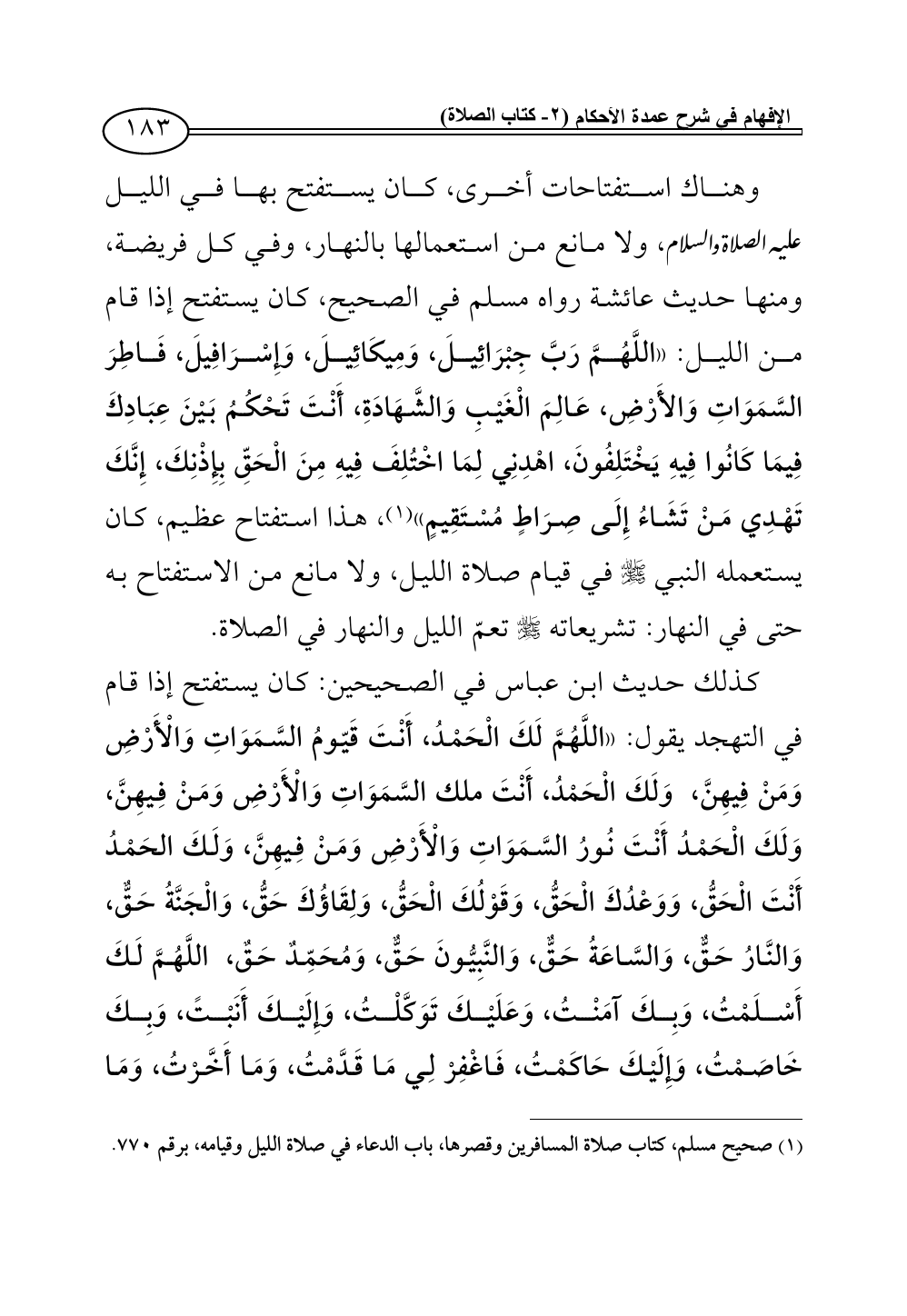 وهناك استفتاحات أخرى، كان يستفتح بها في الليل - عليه الصلاة والسلام -، ولا مانع من استعمالها بالنهار، وفي كل فريضة، ومنها حديث عائشة رواه مسلم في الصحيح، كان يستفتح إذا قام من الليل: «اللَّهُمَّ رَبَّ جِبْرَائِيلَ، وَمِيكَائِيلَ، وَإِسْرَافِيلَ، فَاطِرَ السَّمَوَاتِ وَالأَرْضِ، عَالِمَ الْغَيْبِ وَالشَّهَادَةِ، أَنْتَ تَحْكُمُ بَيْنَ عِبَادِكَ فِيمَا كَانُوا فِيهِ يَخْتَلِفُونَ، اهْدِنِي لِمَا اخْتُلِفَ فِيهِ مِنَ الْحَقِّ بِإِذْنِكَ، إِنَّكَ تَهْدِي مَنْ تَشَاءُ إِلَى صِرَاطٍ مُسْتَقِيمٍ» (¬1)، هذا استفتاح عظيم، كان يستعمله النبي - صلى الله عليه وسلم - في قيام صلاة الليل، ولا مانع من الاستفتاح به حتى في النهار: تشريعاته - صلى الله عليه وسلم - تعمّ الليل والنهار في الصلاة.