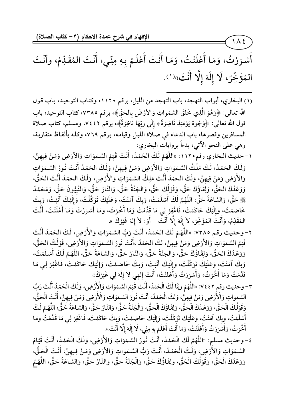 1 - حديث البخاري رقم1120: «اللَّهُمَّ لَكَ الحَمْدُ، أَنْتَ قَيِّمُ السَّمَوَاتِ وَالأَرْضِ وَمَنْ فِيهِنَّ، وَلَكَ الحَمْدُ، لَكَ مُلْكُ السَّمَوَاتِ وَالأَرْضِ وَمَنْ فِيهِنَّ، وَلَكَ الحَمْدُ أَنْتَ نُورُ السَّمَوَاتِ وَالأَرْضِ وَمَنْ فِيهِنَّ، وَلَكَ الحَمْدُ أَنْتَ مَلِكُ السَّمَوَاتِ وَالأَرْضِ، وَلَكَ الحَمْدُ أَنْتَ الحَقُّ، وَوَعْدُكَ الحَقُّ، وَلِقَاؤُكَ حَقٌّ، وَقَوْلُكَ حَقٌّ، وَالجَنَّةُ حَقٌّ، وَالنَّارُ حَقٌّ، وَالنَّبِيُّونَ حَقٌّ، وَمُحَمَّدٌ - صلى الله عليه وسلم - حَقٌّ، وَالسَّاعَةُ حَقٌّ، اللَّهُمَّ لَكَ أَسْلَمْتُ، وَبِكَ آمَنْتُ، وَعَلَيْكَ تَوَكَّلْتُ، وَإِلَيْكَ أَنَبْتُ، وَبِكَ خَاصَمْتُ، وَإِلَيْكَ حَاكَمْتُ، فَاغْفِرْ لِي مَا قَدَّمْتُ وَمَا أَخَّرْتُ، وَمَا أَسْرَرْتُ وَمَا أَعْلَنْتُ، أَنْتَ المُقَدِّمُ، وَأَنْتَ المُؤَخِّرُ، لاَ إِلَهَ إِلَّا أَنْتَ - أَوْ: لاَ إِلَهَ غَيْرُكَ».