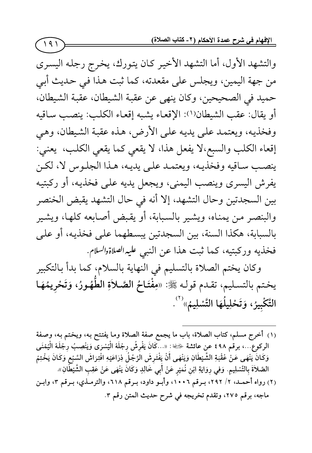 (¬1) أخرج مسلم، كتاب الصلاة، باب ما يجمع صفة الصلاة وما يفتتح به، ويختم به، وصفة الركوع ... ، برقم 498 عن عائشة - رضي الله عنها -: «... كَانَ يَفْرِشُ رِجْلَهُ الْيُسْرَى وَيَنْصِبُ رِجْلَهُ الْيُمْنَى وَكَانَ يَنْهَى عَنْ عُقْبَةِ الشَّيْطَانِ وَيَنْهَى أَنْ يَفْتَرِشَ الرَّجُلُ ذِرَاعَيْهِ افْتِرَاشَ السَّبُعِ وَكَانَ يَخْتِمُ الصَّلاَةَ بِالتَّسْلِيمِ. وَفِي رِوَايَةِ ابْنِ نُمَيْرٍ عَنْ أَبِي خَالِدٍ وَكَانَ يَنْهَى عَنْ عَقِبِ الشَّيْطَانِ».