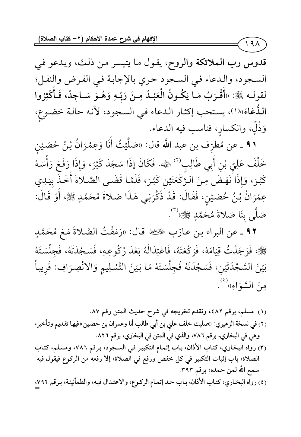92 - عن البراء بن عازب - رضي الله عنهما - قال: «رَمَقْتُ الصَّلاةَ مَعَ مُحَمَّدٍ - صلى الله عليه وسلم -، فَوَجَدْتُ قِيَامَهُ، فَرَكْعَتَهُ، فَاعْتِدَالَهُ بَعْدَ رُكُوعِهِ، فَسَجْدَتَهُ، فَجِلْسَتَهُ بَيْنَ السَّجْدَتَيْنِ، فَسَجْدَتَهُ فَجِلْسَتَهُ مَا بَيْنَ التَّسْلِيمِ وَالانْصِرَافِ: قَرِيباً مِنَ السَّوَاءِ» (¬4).
