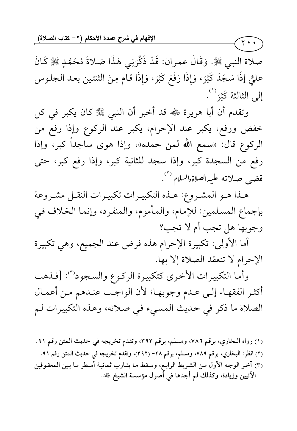 وتقدم أن أبا هريرة - رضي الله عنه - قد أخبر أن النبي - صلى الله عليه وسلم - كان يكبر في كل خفض ورفع، يكبر عند الإحرام، يكبر عند الركوع وإذا رفع من الركوع قال: «سمع اللَّه لمن حمده» , وإذا هوى ساجداً كبر، وإذا رفع من السجدة كبر، وإذا سجد للثانية كبر، وإذا رفع كبر، حتى قضى صلاته - عليه الصلاة والسلام - (¬2).