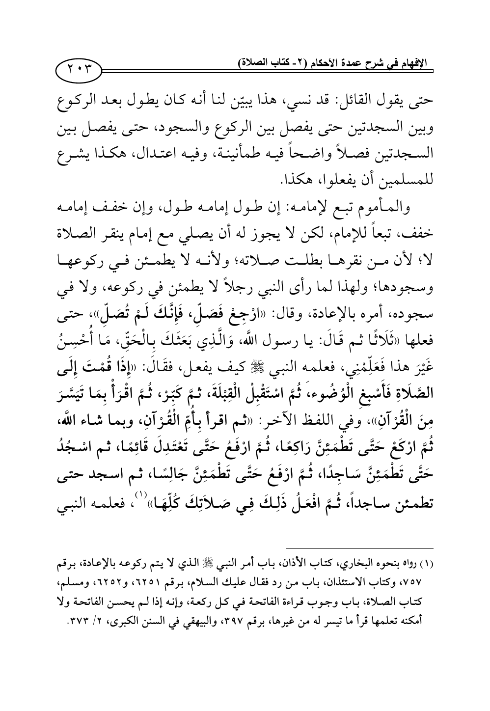 (¬1) رواه بنحوه البخاري، كتاب الأذان، باب أمر النبي - صلى الله عليه وسلم - الذي لا يتم ركوعه بالإعادة، برقم 757، وكتاب الاستئذان، باب من رد فقال عليك السلام، برقم 6251، و6252، ومسلم، كتاب الصلاة، باب وجوب قراءة الفاتحة في كل ركعة، وإنه إذا لم يحسن الفاتحة ولا أمكنه تعلمها قرأ ما تيسر له من غيرها، برقم 397، والبيهقي في السنن الكبرى، 2/ 373.