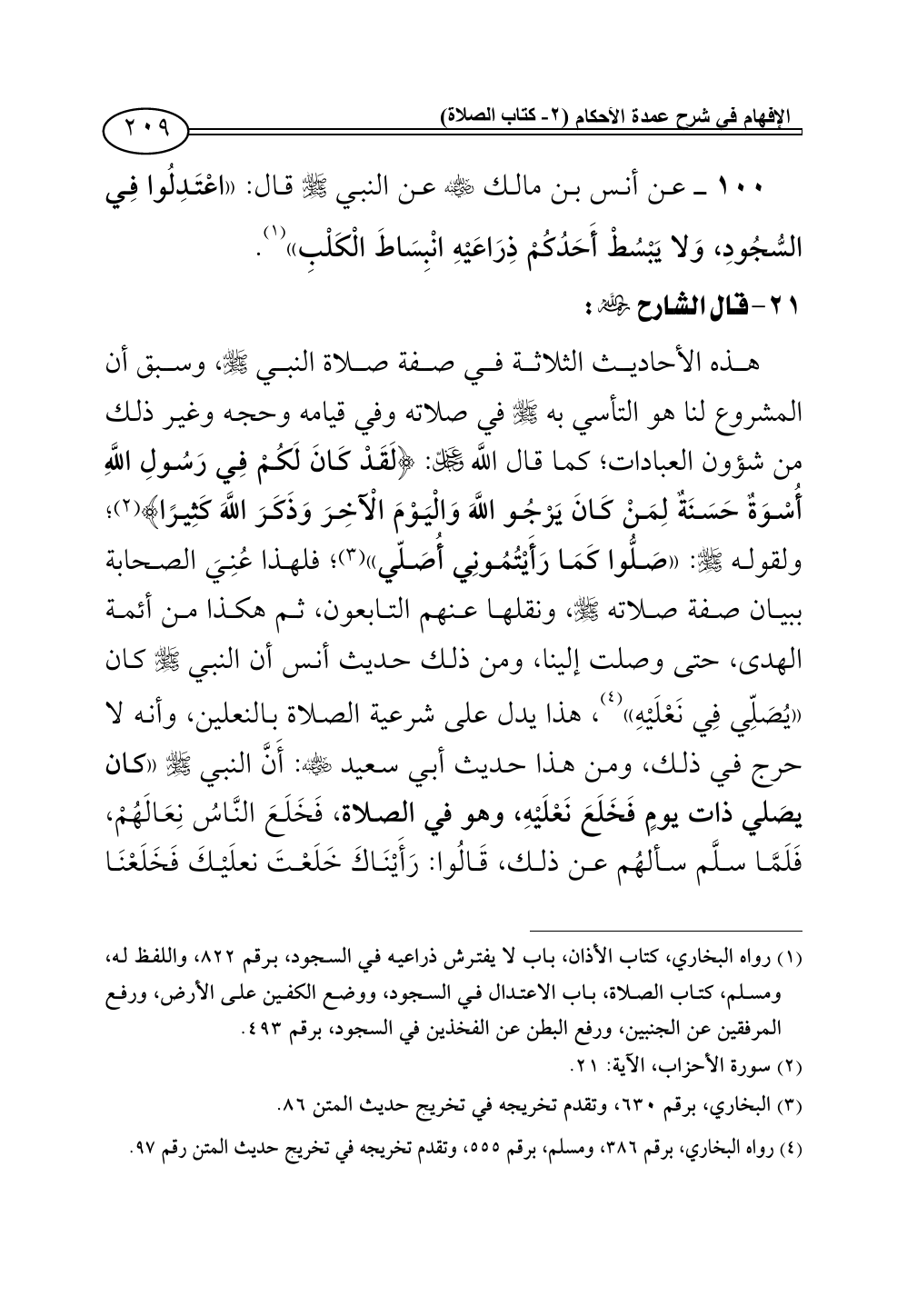 هذه الأحاديث الثلاثة في صفة صلاة النبي - صلى الله عليه وسلم -، وسبق أن المشروع لنا هو التأسي به - صلى الله عليه وسلم - في صلاته وفي قيامه وحجه وغير ذلك من شؤون العبادات؛ كما قال اللَّه - عز وجل -: {لَقَدْ كَانَ لَكُمْ فِي رَسُولِ اللَّهِ أُسْوَةٌ حَسَنَةٌ لِمَنْ كَانَ يَرْجُو اللَّهَ وَالْيَوْمَ الْآخِرَ وَذَكَرَ اللَّهَ كَثِيرًا} (¬2)؛ ولقوله - صلى الله عليه وسلم -: «صَلُّوا كَمَا رَأَيْتُمُونِي أُصَلّي» (¬3)؛ فلهذا عُنِيَ الصحابة ببيان صفة صلاته - صلى الله عليه وسلم - , ونقلها عنهم التابعون, ثم هكذا من أئمة الهدى, حتى وصلت إلينا, ومن ذلك حديث أنس أن النبي - صلى الله عليه وسلم - كان «يُصَلِّي فِي نَعْلَيْهِ» (¬4)،