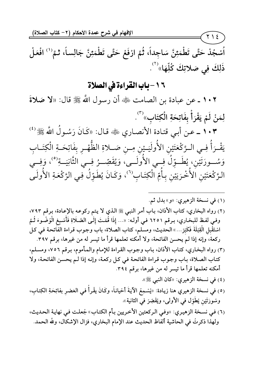 102 - عن عبادة بن الصامت - رضي الله عنه - أن رسول اللَّه - صلى الله عليه وسلم - قال: «لا صَلاةَ لِمَنْ لَمْ يَقْرَا بِفَاتِحَةِ الْكِتَابِ» (¬3).