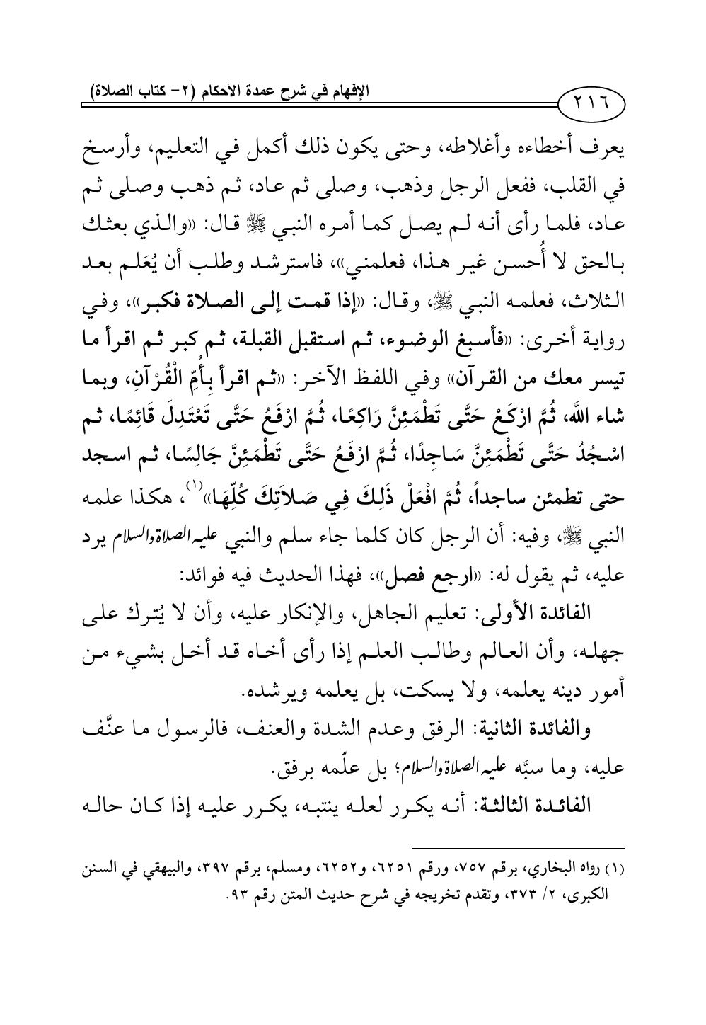 يعرف أخطاءه وأغلاطه, وحتى يكون ذلك أكمل في التعليم، وأرسخ في القلب, ففعل الرجل وذهب, وصلى ثم عاد, ثم ذهب وصلى ثم عاد, فلما رأى أنه لم يصل كما أمره النبي - صلى الله عليه وسلم - قال: «والذي بعثك بالحق لا أُحسن غير هذا, فعلمني»، فاسترشد وطلب أن يُعَلم بعد الثلاث, فعلمه النبي - صلى الله عليه وسلم - , وقال: «إذا قمت إلى الصلاة فكبر» , وفي رواية أخرى: «فأسبغ الوضوء, ثم استقبل القبلة, ثم كبر ثم اقرأ ما تيسر معك من القرآن» وفي اللفظ الآخر: «ثم اقرأ بِأُمِّ الْقُرْآنِ، وبما شاء اللَّه، ثُمَّ ارْكَعْ حَتَّى تَطْمَئِنَّ رَاكِعًا، ثُمَّ ارْفَعُ حَتَّى تَعْتَدِلَ قَائِمًا، ثم اسْجُدُ حَتَّى تَطْمَئِنَّ سَاجِدًا، ثُمَّ ارْفَعُ حَتَّى تَطْمَئِنَّ جَالِسًا، ثم اسجد حتى تطمئن ساجداً، ثُمَّ افْعَلْ ذَلِكَ فِي صَلاَتِكَ كُلِّهَا» (¬1)، هكذا علمه النبي - صلى الله عليه وسلم -، وفيه: أن الرجل كان كلما جاء سلم والنبي - عليه الصلاة والسلام - يرد عليه، ثم يقول له: «ارجع فصل» , فهذا الحديث فيه فوائد: