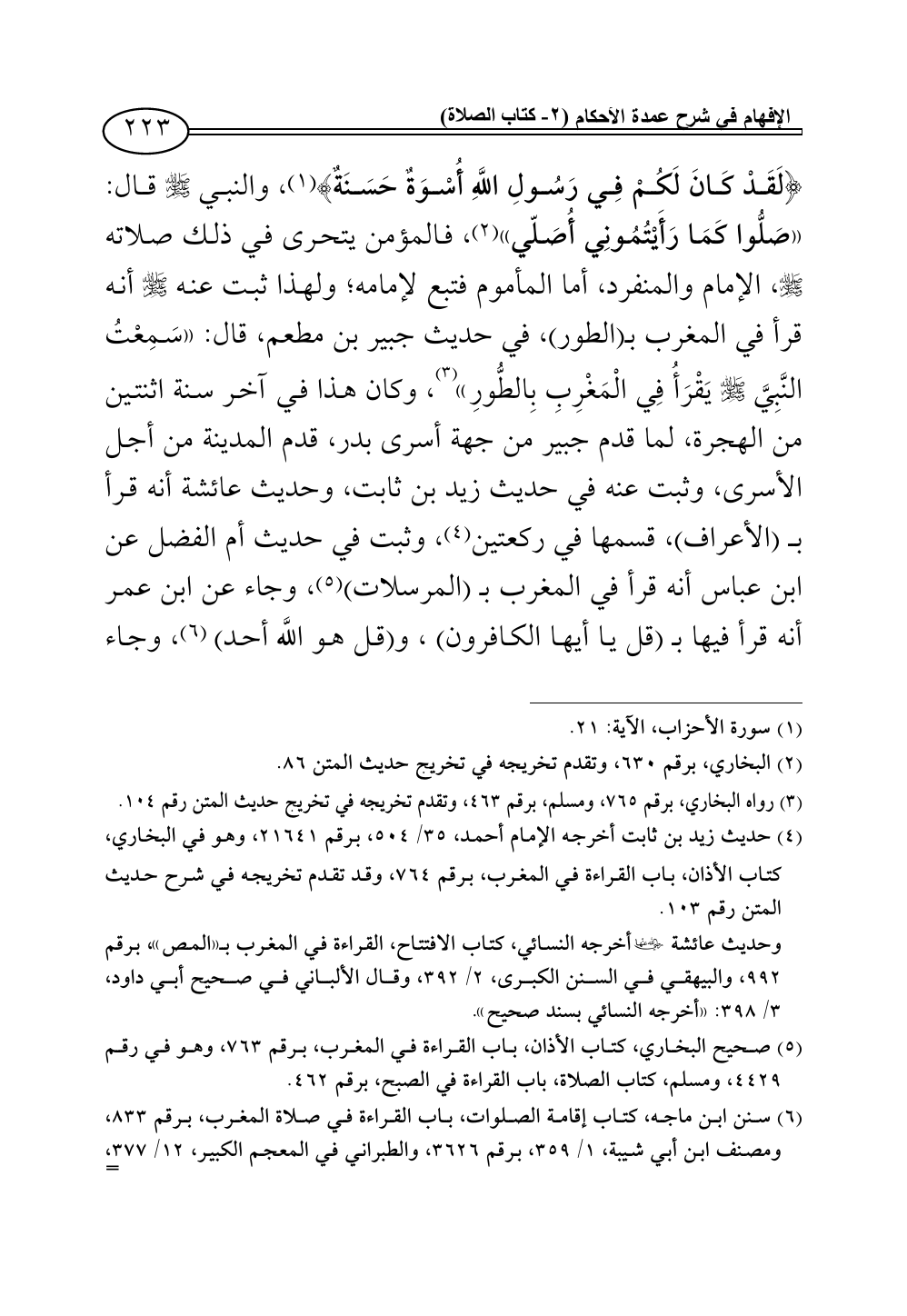 (¬4) حديث زيد بن ثابت أخرجه الإمام أحمد، 35/ 504، برقم 21641، وهو في البخاري، كتاب الأذان، باب القراءة في المغرب، برقم 764، وقد تقدم تخريجه في شرح حديث المتن رقم 103.