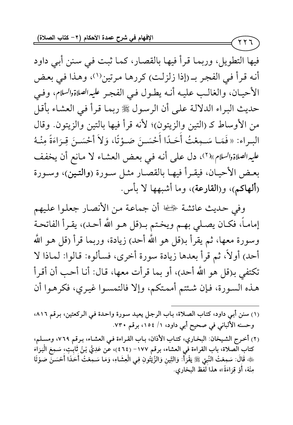 فيها التطويل، وربما قرأ فيها بالقصار, كما ثبت في سنن أبي داود أنه قرأ في الفجر بـ (إذا زلزلت) كررها مرتين (¬1) , وهذا في بعض الأحيان, والغالب عليه أنه يطول في الفجر - عليه الصلاة والسلام -، وفي حديث البراء الدلالة على أن الرسول - صلى الله عليه وسلم - ربما قرأ في العشاء بأقل من الأوساط كـ (التين والزيتون)؛ لأنه قرأ فيها بالتين والزيتون. وقال البراء: «فَمَا سَمِعْتُ أَحَدًا أَحْسَنَ صَوْتًا، وَلاَ أحْسَنَ قِرَاءَةً مِنْهُ - عليه الصلاة والسلام -» (¬2)، دل على أنه في بعض العشاء لا مانع أن يخفف بعض الأحيان, فيقرأ فيها بالقصار مثل سورة (والتين)، وسورة (ألهاكم)، و (القارعة) , وما أشبهها لا بأس.