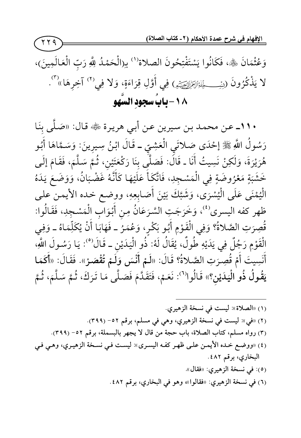 110 - عن محمد بن سيرين عن أبي هريرة - رضي الله عنه - قال: «صَلَّى بِنَا رَسُولُ اللَّهِ - صلى الله عليه وسلم - إحْدَى صَلاتَيِ الْعَشِيِّ ــ قَالَ ابْنُ سِيرِينَ: وَسَمَّاهَا أَبُو هُرَيْرَةَ، وَلَكِنْ نَسِيتُ أَنَا ــ قَالَ: فَصَلَّى بِنَا رَكْعَتَيْنِ، ثُمَّ سَلَّمَ، فَقَامَ إلَى خَشَبَةٍ مَعْرُوضَةٍ فِي الْمَسْجِدِ، فَاتَّكَأَ عَلَيْهَا كَأَنَّهُ غَضْبَانُ، وَوَضَعَ يَدَهُ الْيُمْنَى عَلَى الْيُسْرَى، وَشَبَّكَ بَيْنَ أَصَابِعِهِ، ووضع خده الأيمن على ظهر كفه اليسرى (¬4)، وَخَرَجَتِ السَّرَعَانُ مِنِ أَبْوَابِ الْمَسْجِدِ، فَقَالُوا: قُصِرَتِ الصَّلاةُ؟ وَفِي الْقَوْمِ أَبُو بَكْرٍ، وَعُمَرُ ــ فَهَابَا أَنْ يُكَلِّمَاهُ ــ وَفِي الْقَوْمِ رَجُلٌ فِي يَدَيْهِ طُولٌ، يُقَالُ لَهُ: ذُو الْيَدَيْنِ ــ قَالَ (¬5): يَا رَسُولَ اللَّهِ، أَنَسِيتَ أَمْ قُصِرَتِ الصَّلاةُ؟ قَالَ: «لَمْ أَنْسَ وَلَمْ تُقْصَرْ». فَقَالَ: «أَكَمَا يَقُولُ ذُو الْيَدَيْنِ؟» قَالُوا (¬6): نَعَمْ، فَتَقَدَّمَ فَصَلَّى مَا تَرَكَ، ثُمَّ سَلَّمَ، ثُمَّ