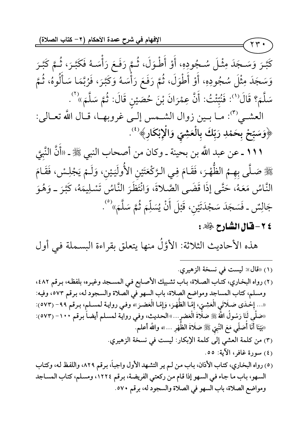 (¬5) رواه البخاري، كتاب الأذان، باب من لم ير التشهد الأول واجباً، برقم 829، واللفظ له، وكتاب السهو، باب ما جاء في السهو إذا قام من ركعتي الفريضة، برقم 1224، ومسلم، كتاب المساجد ومواضع الصلاة، باب السهو في الصلاة والسجود له، برقم 570.