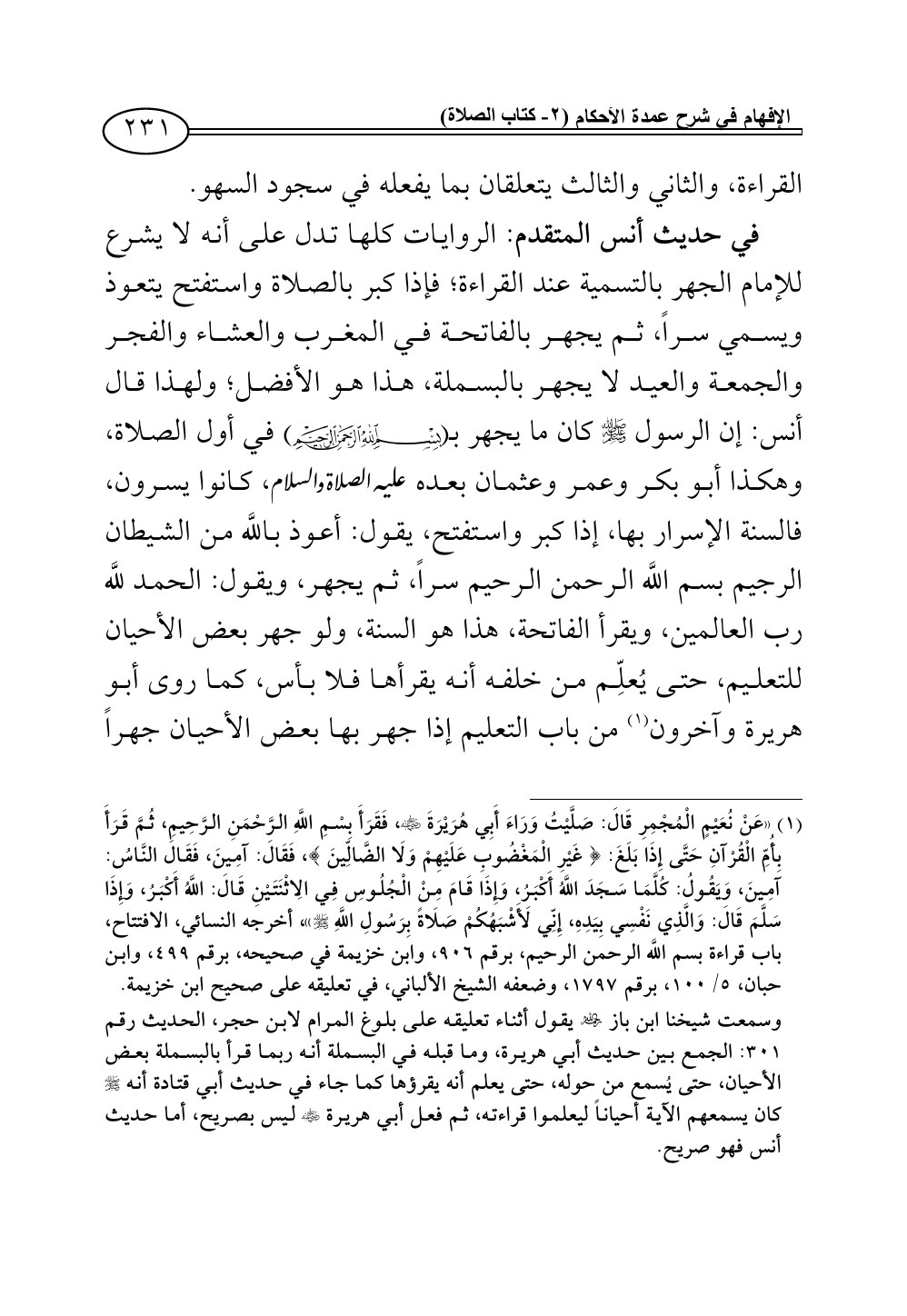 وسمعت شيخنا ابن باز - رحمه الله - يقول أثناء تعليقه على بلوغ المرام لابن حجر، الحديث رقم 301: الجمع بين حديث أبي هريرة، وما قبله في البسملة أنه ربما قرأ بالبسملة بعض الأحيان، حتى يُسمع من حوله، حتى يعلم أنه يقرؤها كما جاء في حديث أبي قتادة أنه - صلى الله عليه وسلم - كان يسمعهم الآية أحياناً ليعلموا قراءته، ثم فعل أبي هريرة - رضي الله عنه - ليس بصريح، أما حديث أنس فهو صريح.
