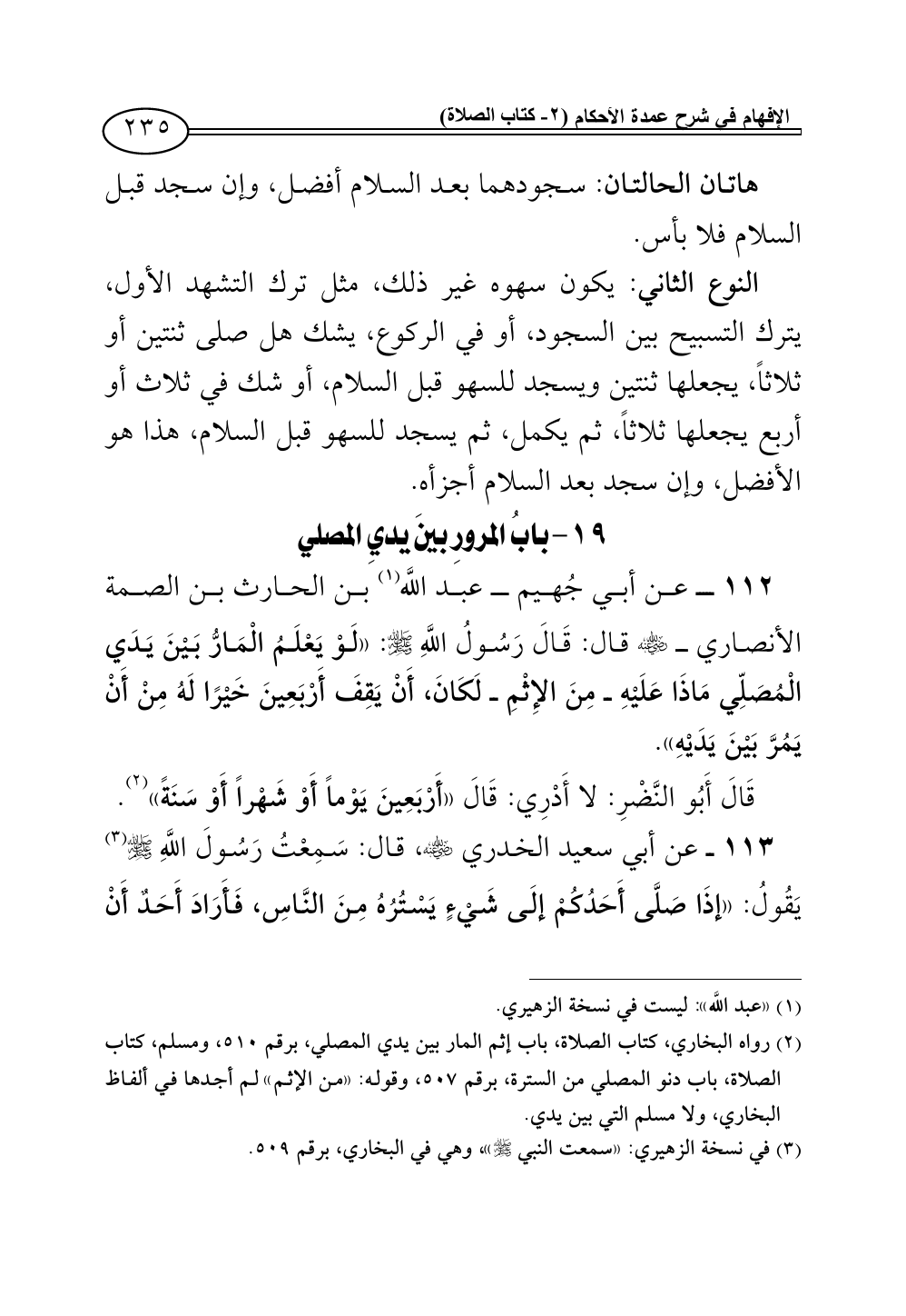112 - عن أبي جُهيم ــ عبد اللَّه (¬1) بن الحارث بن الصمة الأنصاري ــ - رضي الله عنه - قال: قَالَ رَسُولُ اللَّهِ - صلى الله عليه وسلم -: «لَوْ يَعْلَمُ الْمَارُّ بَيْنَ يَدَي الْمُصَلِّي مَاذَا عَلَيْهِ ــ مِنَ الإِثْمِ ــ لَكَانَ، أَنْ يَقِفَ أَرْبَعِينَ خَيْرًا لَهُ مِنْ أَنْ يَمُرَّ بَيْنَ يَدَيْهِ».