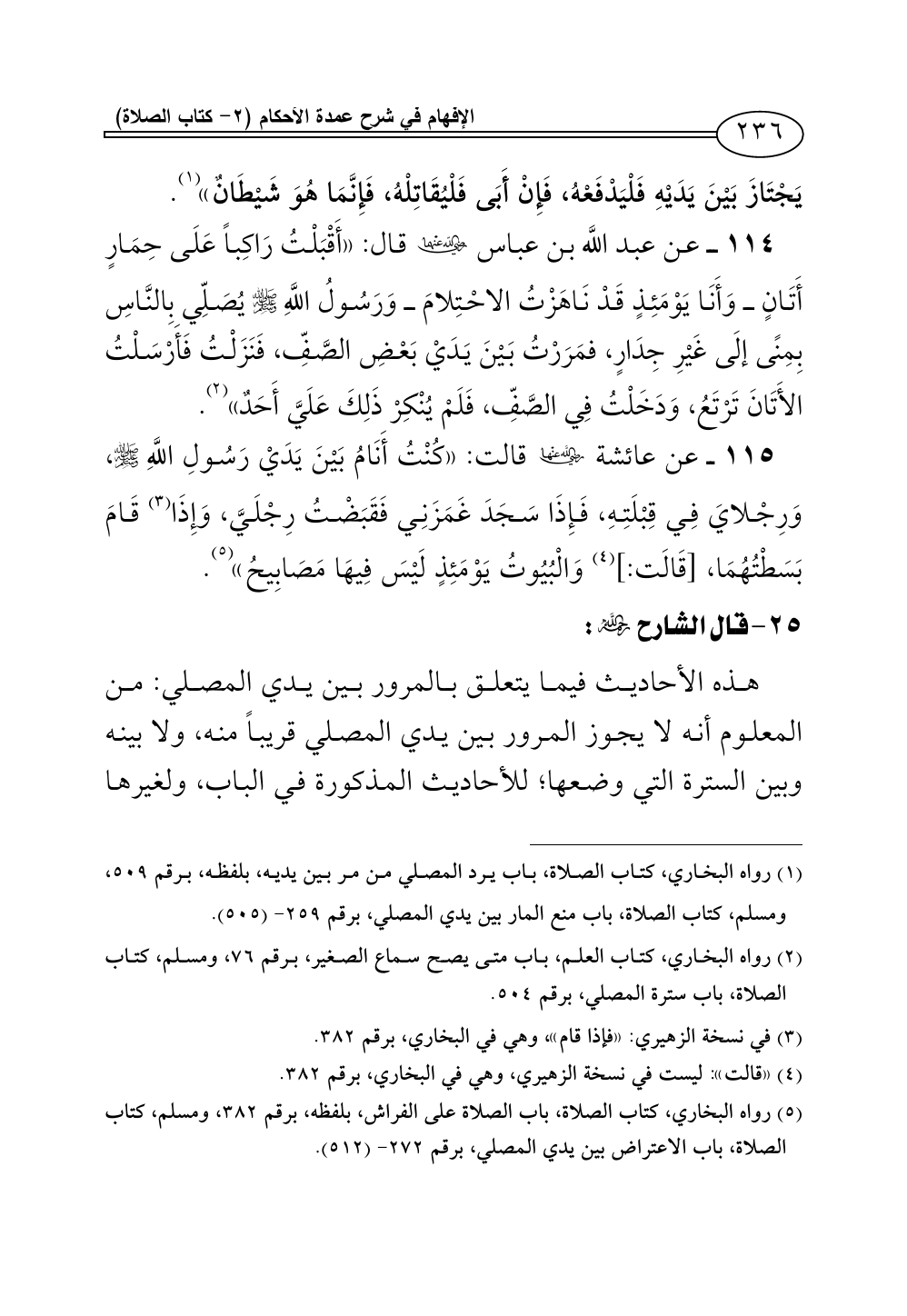 114 - عن عبد اللَّه بن عباس - رضي الله عنهما - قال: «أَقْبَلْتُ رَاكِباً عَلَى حِمَارٍ أَتَانٍ ــ وَأَنَا يَوْمَئِذٍ قَدْ نَاهَزْتُ الاحْتِلامَ ــ وَرَسُولُ اللَّهِ - صلى الله عليه وسلم - يُصَلِّي بِالنَّاسِ بِمِنًى إلَى غَيْرِ جِدَارٍ، فمَرَرْتُ بَيْنَ يَدَيْ بَعْضِ الصَّفِّ، فَنَزَلْتُ فَأَرْسَلْتُ الأَتَانَ تَرْتَعُ، وَدَخَلْتُ فِي الصَّفِّ، فَلَمْ يُنْكِرْ ذَلِكَ عَلَيَّ أَحَدٌ» (¬2).