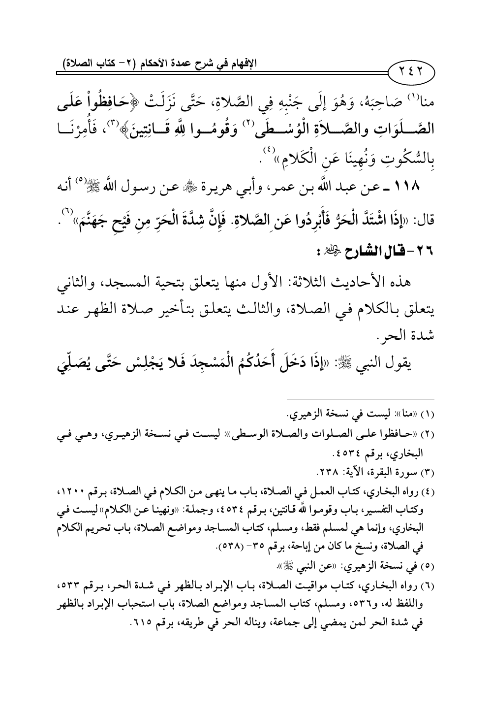 (¬4) رواه البخاري، كتاب العمل في الصلاة، باب ما ينهى من الكلام في الصلاة، برقم 1200، وكتاب التفسير، باب وقوموا للَّه قانتين، برقم 4534، وجملة: «ونهينا عن الكلام» ليست في البخاري، وإنما هي لمسلم فقط، ومسلم، كتاب المساجد ومواضع الصلاة، باب تحريم الكلام في الصلاة، ونسخ ما كان من إباحة، برقم 35 - (538).
