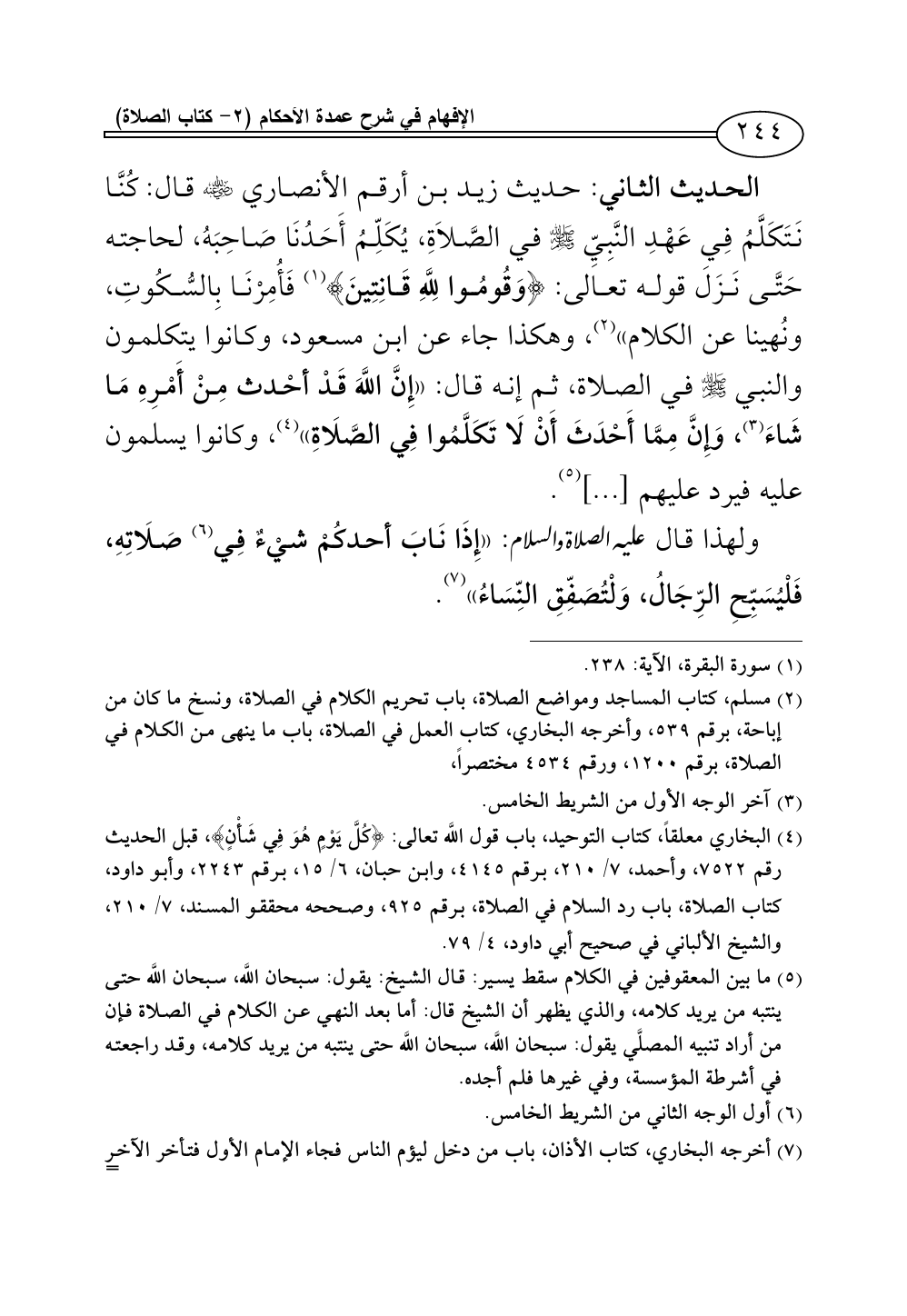 الحديث الثاني: حديث زيد بن أرقم الأنصاري - رضي الله عنه - قال: كُنَّا نَتَكَلَّمُ فِي عَهْدِ النَّبِيِّ - صلى الله عليه وسلم - في الصَّلاَةِ، يُكَلِّمُ أَحَدُنَا صَاحِبَهُ، لحاجته حَتَّى نَزَلَ قوله تعالى: {وَقُومُوا لِلَّهِ قَانِتِينَ} (¬1) فَأُمِرْنَا بِالسُّكُوتِ, ونُهينا عن الكلام» (¬2)، وهكذا جاء عن ابن مسعود، وكانوا يتكلمون والنبي - صلى الله عليه وسلم - في الصلاة, ثم إنه قال: «إِنَّ اللَّهَ قَدْ أحْدث مِنْ أَمْرِهِ مَا شَاءَ (¬3)، وَإِنَّ مِمَّا أَحْدَثَ أَنْ لَا تَكَلَّمُوا فِي الصَّلَاةِ» (¬4)، وكانوا يسلمون عليه فيرد عليهم [...] (¬5).