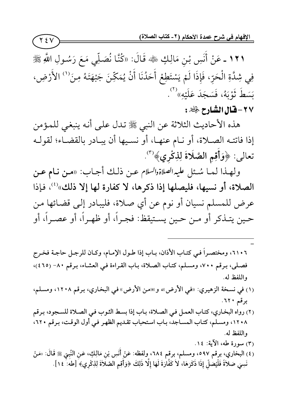 (¬4) البخاري، برقم 597، ومسلم، برقم 684، ولفظه: عَنْ أَنَسِ بْنِ مَالِكٍ، عَنِ النَّبِيِّ - صلى الله عليه وسلم - قَالَ: «مَنْ نَسِيَ صَلاَةً فَلْيُصَلِّ إِذَا ذَكَرَهَا، لاَ كَفَّارَةَ لَهَا إِلَّا ذَلِكَ {وَأَقِمِ الصَّلاَةَ لِذِكْرِي} [طه: 14].