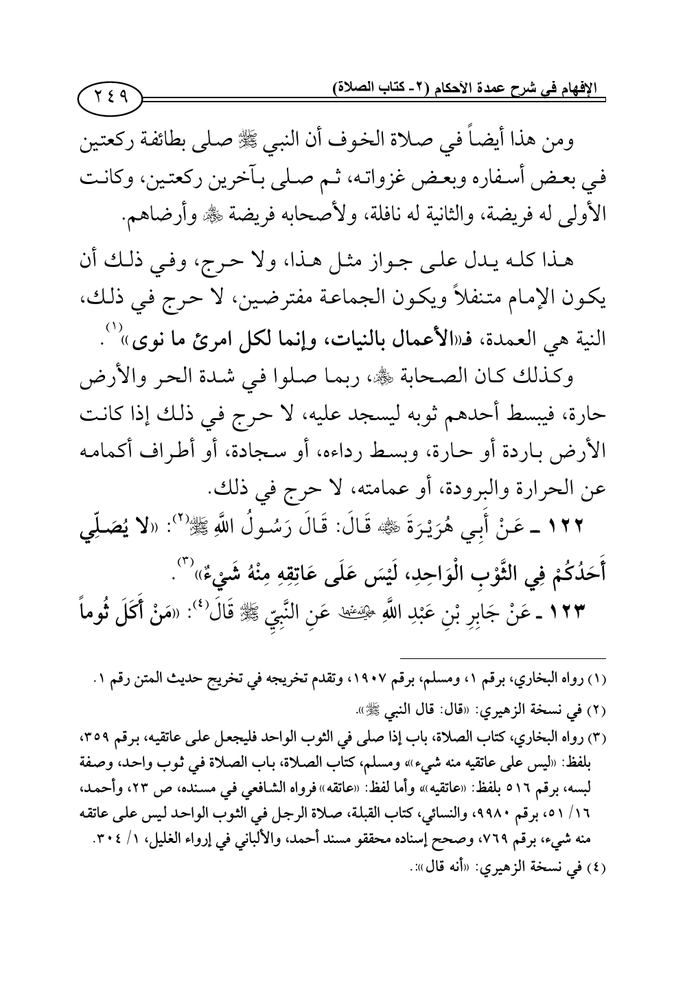 122 - عَنْ أَبِي هُرَيْرَةَ - رضي الله عنه - قَالَ: قَالَ رَسُولُ اللَّهِ - صلى الله عليه وسلم - (¬2): «لا يُصَلِّي أَحَدُكُمْ فِي الثَّوْبِ الْوَاحِدِ، لَيْسَ عَلَى عَاتِقِهِ مِنْهُ شَيْءٌ» (¬3).