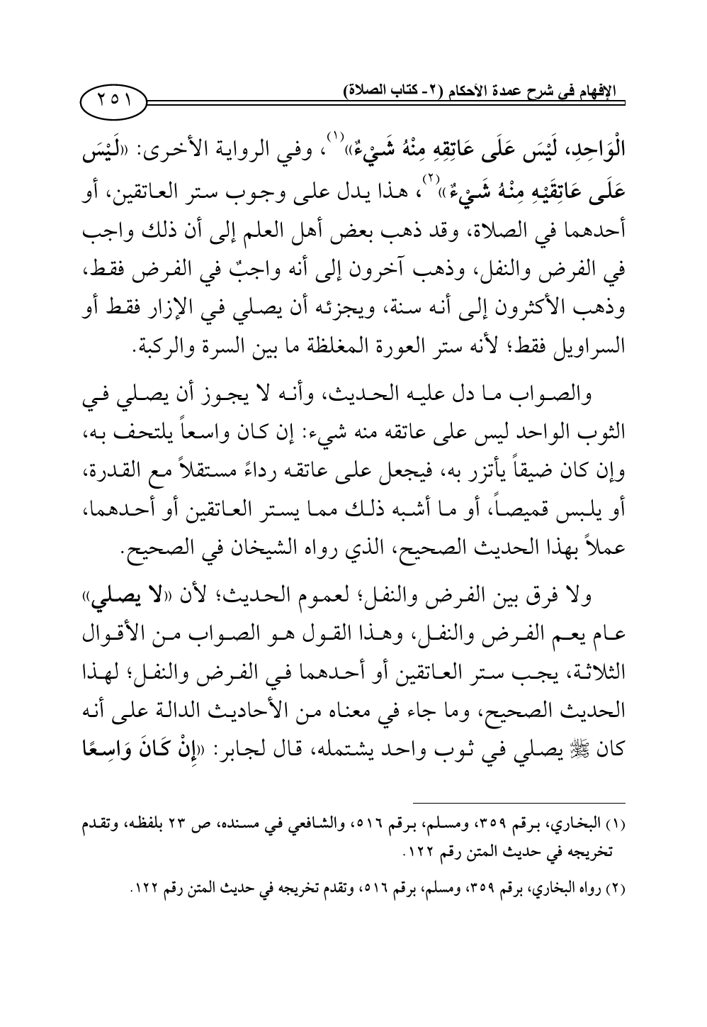 الْوَاحِدِ، لَيْسَ عَلَى عَاتِقِهِ مِنْهُ شَيْءٌ» (¬1) , وفي الرواية الأخرى: «لَيْسَ عَلَى عَاتِقَيْهِ مِنْهُ شَيْءٌ» (¬2)، هذا يدل على وجوب ستر العاتقين، أو أحدهما في الصلاة، وقد ذهب بعض أهل العلم إلى أن ذلك واجب في الفرض والنفل, وذهب آخرون إلى أنه واجبٌ في الفرض فقط، وذهب الأكثرون إلى أنه سنة, ويجزئه أن يصلي في الإزار فقط أو السراويل فقط؛ لأنه ستر العورة المغلظة ما بين السرة والركبة.