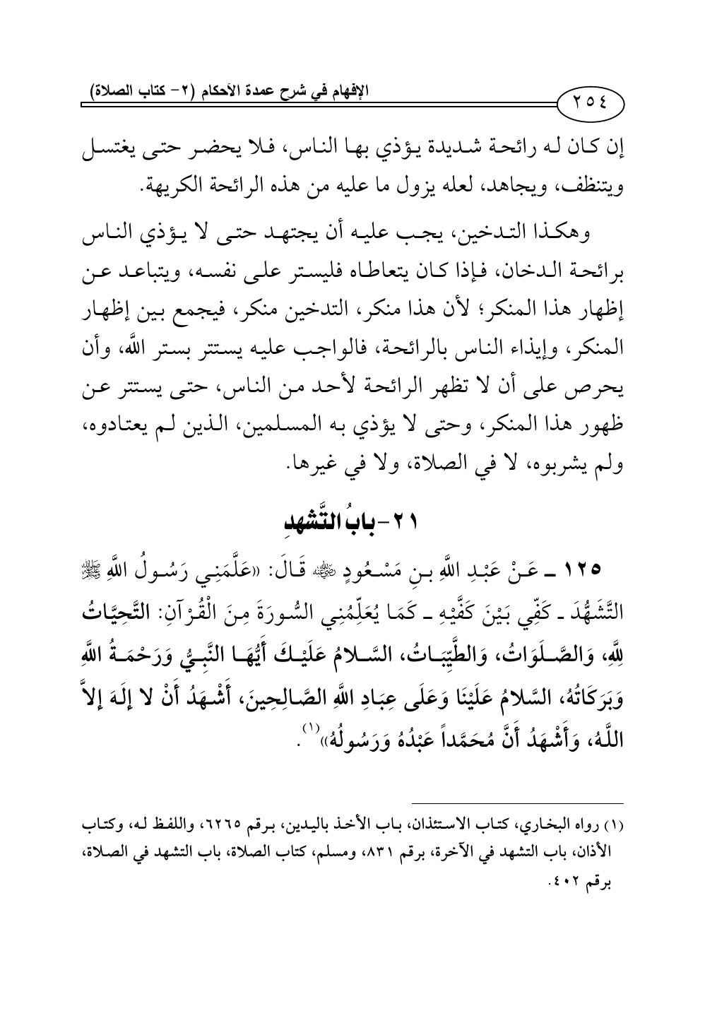 125 - عَنْ عَبْدِ اللَّهِ بنِ مَسْعُودٍ - رضي الله عنه - قَالَ: «عَلَّمَنِي رَسُولُ اللَّهِ - صلى الله عليه وسلم - التَّشَهُّدَ ــ كَفِّي بَيْنَ كَفَّيْهِ ــ كَمَا يُعَلِّمُنِي السُّورَةَ مِنَ الْقُرْآنِ: التَّحِيَّاتُ لِلَّهِ، وَالصَّلَوَاتُ، وَالطَّيِّبَاتُ، السَّلامُ عَلَيْكَ أَيُّهَا النَّبِيُّ وَرَحْمَةُ اللَّهِ وَبَرَكَاتُهُ، السَّلامُ عَلَيْنَا وَعَلَى عِبَادِ اللَّهِ الصَّالِحِينَ، أَشْهَدُ أَنْ لا إلَهَ إلاَّ اللَّهُ، وَأَشْهَدُ أَنَّ مُحَمَّداً عَبْدُهُ وَرَسُولُهُ» (¬1).