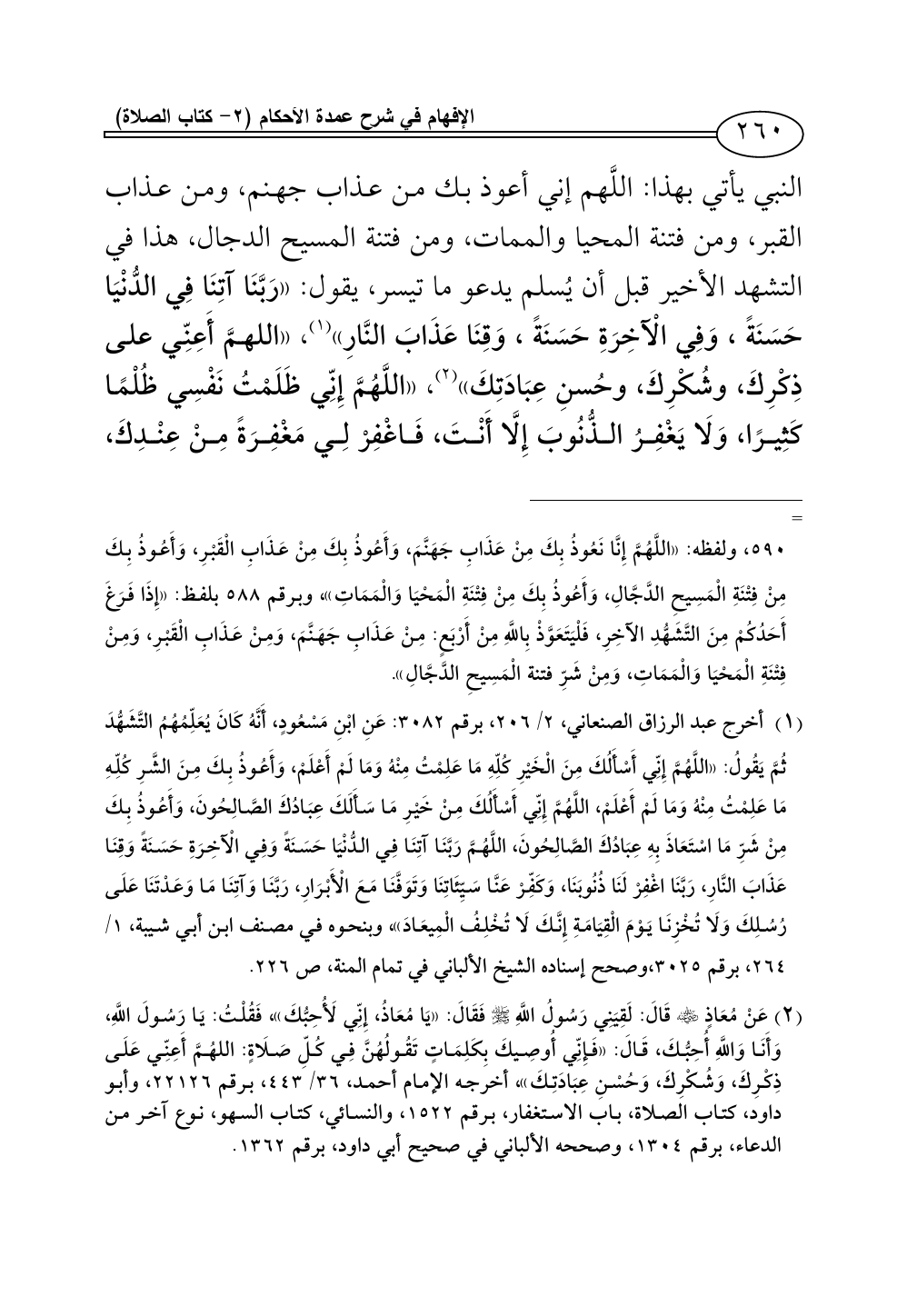 (¬1) أخرج عبد الرزاق الصنعاني، 2/ 206، برقم 3082: عَنِ ابْنِ مَسْعُودٍ، أَنَّهُ كَانَ يُعَلِّمُهُمُ التَّشَهُّدَ ثُمَّ يَقُولُ: «اللَّهُمَّ إِنِّي أَسْأَلُكَ مِنَ الْخَيْرِ كُلِّهِ مَا عَلِمْتُ مِنْهُ وَمَا لَمْ أَعْلَمْ، وَأَعُوذُ بِكَ مِنَ الشَّرِ كُلِّهِ مَا عَلِمْتُ مِنْهُ وَمَا لَمْ أَعْلَمْ، اللَّهُمَّ إِنِّي أَسْأَلُكَ مِنْ خَيْرِ مَا سَأَلَكَ عِبَادُكَ الصَّالِحُونَ، وَأَعُوذُ بِكَ مِنْ شَرِّ مَا اسْتَعَاذَ بِهِ عِبَادُكَ الصَّالِحُونَ، اللَّهُمَّ رَبَّنَا آتِنَا فِي الدُّنْيَا حَسَنَةً وَفِي الْآخِرَةِ حَسَنَةً وَقِنَا عَذَابَ النَّارِ، رَبَّنَا اغْفِرْ لَنَا ذُنُوبَنَا، وَكَفِّرْ عَنَّا سَيِّئَاتِنَا وَتَوَفَّنَا مَعَ الْأَبْرَارِ، رَبَّنَا وَآتِنَا مَا وَعَدْتَنَا عَلَى رُسُلِكَ وَلَا تُخْزِنَا يَوْمَ الْقِيَامَةِ إِنَّكَ لَا تُخْلِفُ الْمِيعَادَ»، وبنحوه في مصنف ابن أبي شيبة، 1/ 264، برقم 3025،وصحح إسناده الشيخ الألباني في تمام المنة، ص 226 ..