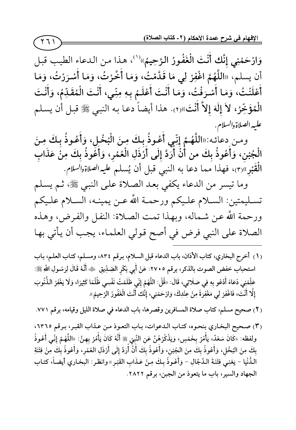 (¬1) أخرج البخاري، كتاب الأذان، باب الدعاء قبل السلام، برقم 834، ومسلم، كتاب العلم، باب استحباب خفض الصوت بالذكر، برقم 2705: عَنْ أَبِي بَكْرٍ الصِّدِّيقِ - رضي الله عنه - أَنَّهُ قَالَ لِرَسُولِ اللَّهِ - صلى الله عليه وسلم -: عَلِّمْنِي دُعَاءً أَدْعُو بِهِ فِي صَلَاتِي، قَالَ: «قُلْ: اللَّهُمَّ إِنِّي ظَلَمْتُ نَفْسِي ظُلْمًا كَثِيرًا، وَلَا يَغْفِرُ الذُّنُوبَ إِلَّا أَنْتَ، فَاغْفِرْ لِي مَغْفِرَةً مِنْ عِنْدِكَ، وَارْحَمْنِي، إِنَّك أَنْتَ الْغَفُورُ الرَّحِيمُ».