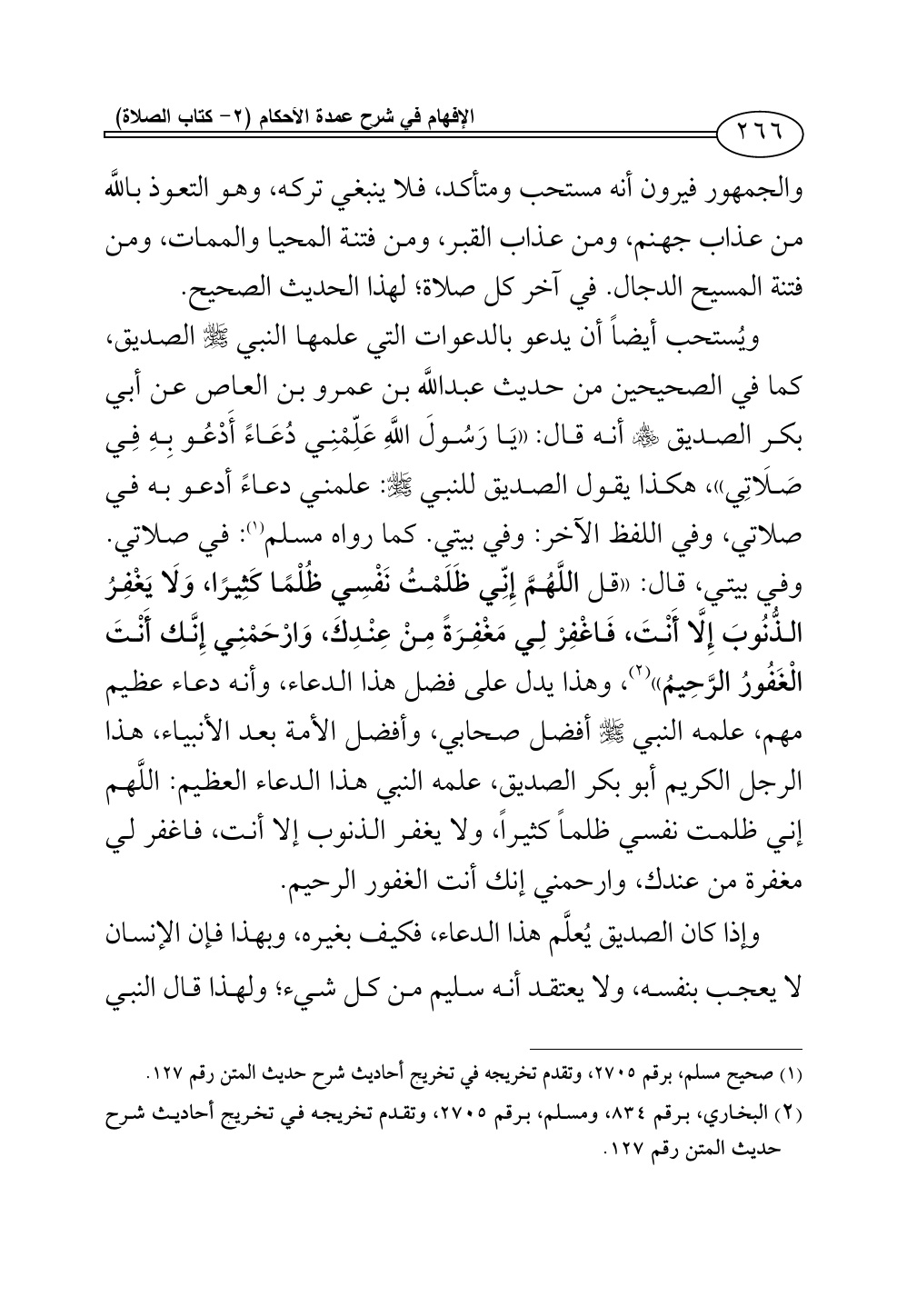 ويُستحب أيضاً أن يدعو بالدعوات التي علمها النبي - صلى الله عليه وسلم - الصديق, كما في الصحيحين من حديث عبداللَّه بن عمرو بن العاص عن أبي بكر الصديق - رضي الله عنهم - أنه قال: «يَا رَسُولَ اللَّهِ عَلِّمْنِي دُعَاءً أَدْعُو بِهِ فِي صَلَاتِي»، هكذا يقول الصديق للنبي - صلى الله عليه وسلم -: علمني دعاءً أدعو به في صلاتي، وفي اللفظ الآخر: وفي بيتي. كما رواه مسلم (¬1): في صلاتي. وفي بيتي، قال: «قل اللَّهُمَّ إِنِّي ظَلَمْتُ نَفْسِي ظُلْمًا كَثِيرًا، وَلَا يَغْفِرُ الذُّنُوبَ إِلَّا أَنْتَ، فَاغْفِرْ لِي مَغْفِرَةً مِنْ عِنْدِكَ، وَارْحَمْنِي إِنَّك أَنْتَ الْغَفُورُ الرَّحِيمُ» (¬2) , وهذا يدل على فضل هذا الدعاء, وأنه دعاء عظيم مهم, علمه النبي - صلى الله عليه وسلم - أفضل صحابي، وأفضل الأمة بعد الأنبياء, هذا الرجل الكريم أبو بكر الصديق, علمه النبي هذا الدعاء العظيم: اللَّهم إني ظلمت نفسي ظلماً كثيراً, ولا يغفر الذنوب إلا أنت, فاغفر لي مغفرة من عندك, وارحمني إنك أنت الغفور الرحيم.