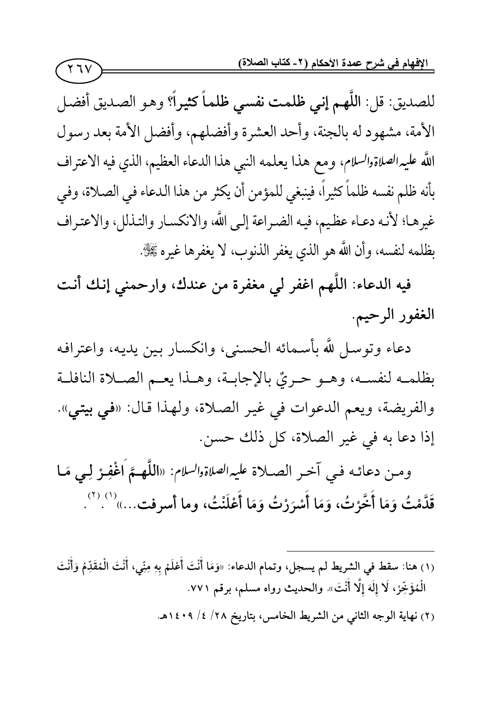 للصديق: قل: اللَّهم إني ظلمت نفسي ظلماً كثيراً؟ وهو الصديق أفضل الأمة، مشهود له بالجنة، وأحد العشرة وأفضلهم، وأفضل الأمة بعد رسول اللَّه - عليه الصلاة والسلام -، ومع هذا يعلمه النبي هذا الدعاء العظيم, الذي فيه الاعتراف بأنه ظلم نفسه ظلماً كثيراً, فينبغي للمؤمن أن يكثر من هذا الدعاء في الصلاة، وفي غيرها؛ لأنه دعاء عظيم, فيه الضراعة إلى اللَّه, والانكسار والتذلل, والاعتراف بظلمه لنفسه, وأن اللَّه هو الذي يغفر الذنوب, لا يغفرها غيره - سبحانه وتعالى -.