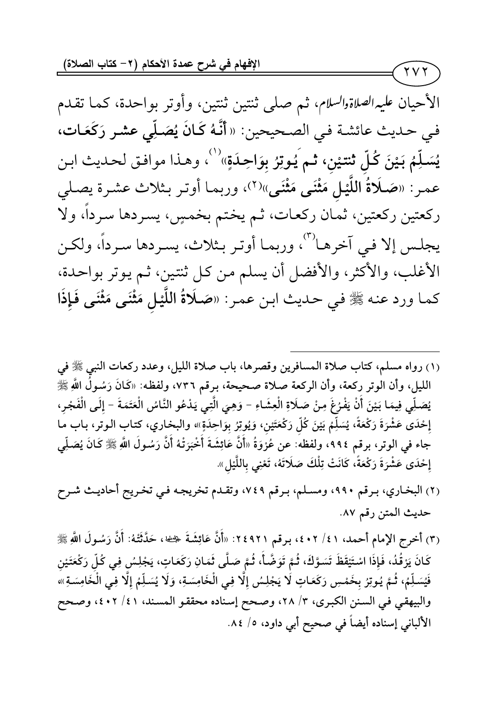 وربما أوتر بثلاث عشرة يصلي ركعتين ركعتين, ثمان ركعات, ثم يختم بخمسٍ, يسردها سرداً, ولا يجلس إلا في آخرها (¬3) , وربما أوتر بثلاث, يسردها سرداً, ولكن الأغلب، والأكثر، والأفضل أن يسلم من كل ثنتين، ثم يوتر بواحدة, كما ورد عنه - صلى الله عليه وسلم - في حديث ابن عمر: «صَلَاةُ اللَّيْلِ مَثْنَى مَثْنَى فَإِذَا