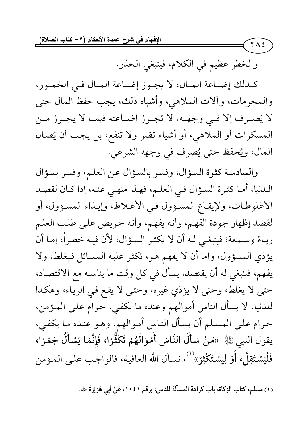 والسادسة كثرة السؤال، وفسر بالسؤال عن العلم، وفسر بسؤال الدنيا، أما كثرة السؤال في العلم، فهذا منهي عنه، إذا كان لقصد الأغلوطات، ولإيقاع المسؤول في الأغلاط، وإيذاء المسؤول، أو لقصد إظهار جودة الفهم، وأنه يفهم، وأنه حريص على طلب العلم رياءً وسمعة؛ فينبغي له أن لا يكثر السؤال، لأن فيه خطراً، إما أن يؤذي المسؤول، وإما أن لا يفهم هو، تكثر عليه المسائل فيغلط، ولا يفهم، فينبغي له أن يقتصد، يسأل في كل وقت ما يناسبه مع الاقتصاد، حتى لا يغلط، وحتى لا يؤذي غيره، وحتى لا يقع في الرياء، وهكذا للدنيا، لا يسأل الناس أموالهم وعنده ما يكفي، حرام على المؤمن، حرام على المسلم أن يسأل الناس أموالهم، وهو عنده ما يكفي، يقول النبي - صلى الله عليه وسلم -: «مَنْ سَأَلَ النَّاسَ أَمْوَالَهُمْ تَكَثُّرًا، فَإِنَّمَا يَسْأَلُ جَمْرًا، فَلْيَسْتَقِلَّ، أَوْ لِيَسْتَكْثِرْ» (¬1)، نسأل اللَّه العافية، فالواجب على المؤمن