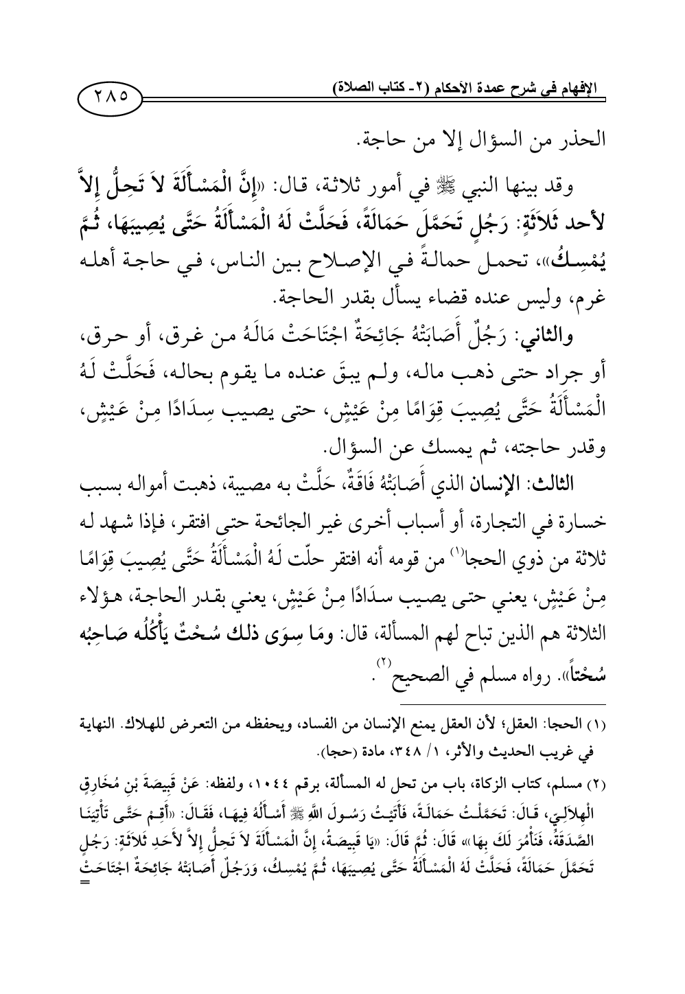 (¬2) مسلم، كتاب الزكاة، باب من تحل له المسألة، برقم 1044، ولفظه: عَنْ قَبِيصَةَ بْنِ مُخَارِقٍ الْهِلاَلِيِّ، قَالَ: تَحَمَّلْتُ حَمَالَةً، فَأَتَيْتُ رَسُولَ اللَّهِ - صلى الله عليه وسلم - أَسْأَلُهُ فِيهَا، فَقَالَ: «أَقِمْ حَتَّى تَاتِيَنَا الصَّدَقَةُ، فَنَامُرَ لَكَ بِهَا»، قَالَ: ثُمَّ قَالَ: «يَا قَبِيصَةُ، إِنَّ الْمَسْأَلَةَ لاَ تَحِلُّ إِلاَّ لأَحَدِ ثَلاَثَةٍ: رَجُلٍ تَحَمَّلَ حَمَالَةً، فَحَلَّتْ لَهُ الْمَسْأَلَةُ حَتَّى يُصِيبَهَا، ثُمَّ يُمْسِكُ، وَرَجُلٌ أَصَابَتْهُ جَائِحَةٌ اجْتَاحَتْ مَالَهُ، فَحَلَّتْ لَهُ الْمَسْأَلَةُ حَتَّى يُصِيبَ قِوَامًا مِنْ عَيْشٍ، أَوْ قَالَ سِدَادًا مِنْ عَيْشٍ، وَرَجُلٌ أَصَابَتْهُ فَاقَةٌ حَتَّى يَقُومَ ثَلاَثَةٌ مِنْ ذَوِي الْحِجَا مِنْ قَوْمِهِ: لَقَدْ أَصَابَتْ فُلاَنًا فَاقَةٌ، فَحَلَّتْ لَهُ الْمَسْأَلَةُ حَتَّى يُصِيبَ قِوَامًا مِنْ عَيْشٍ، أَوْ قَالَ سِدَادًا مِنْ عَيْشٍ، فَمَا سِوَاهُنَّ مِنَ الْمَسْأَلَةِ يَا قَبِيصَةُ سُحْتًا يَاكُلُهَا صَاحِبُهَا سُحْتًا».