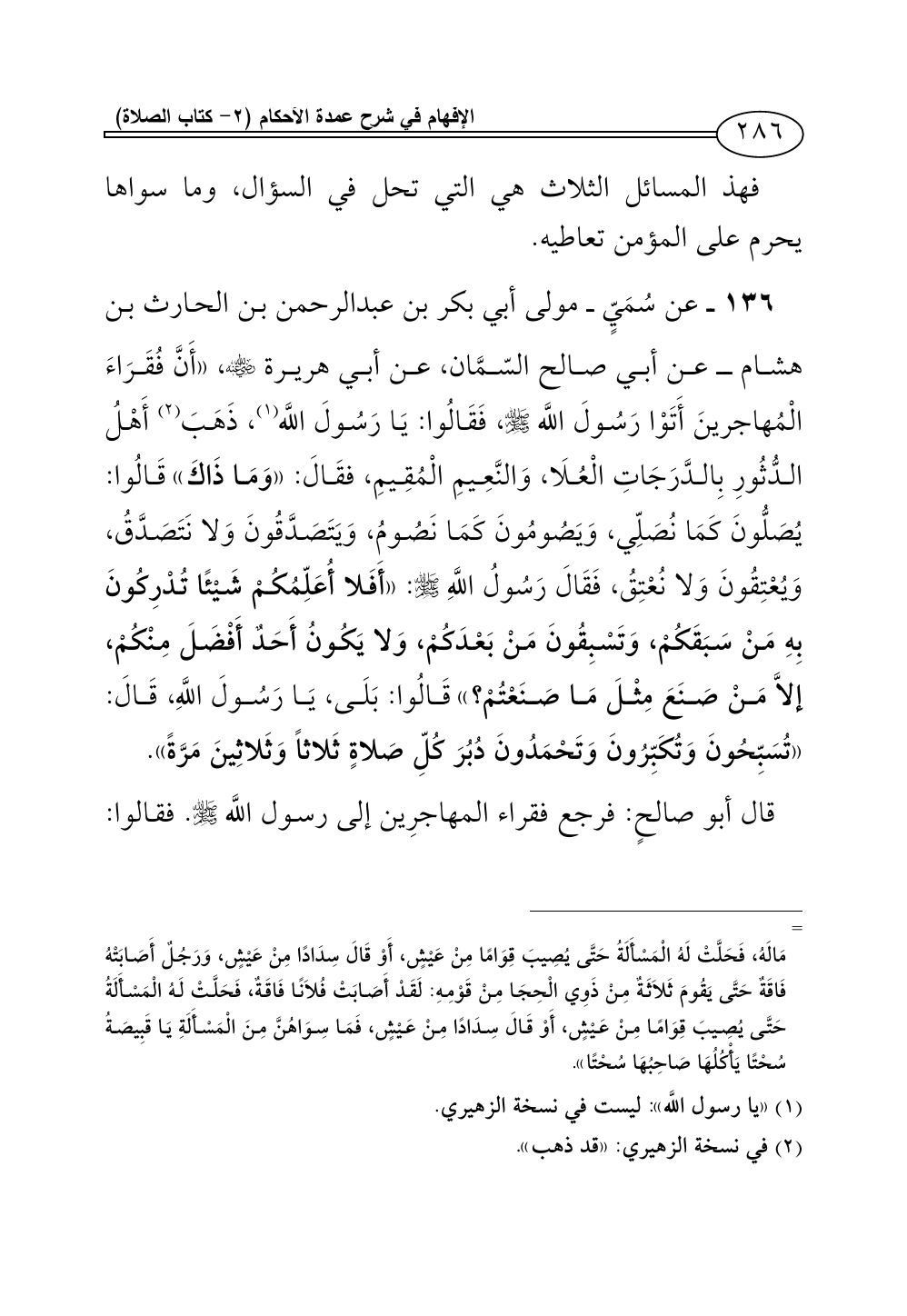 136 - عن سُمَيٍّ ــ مولى أبي بكر بن عبدالرحمن بن الحارث بن هشام ــ عن أبي صالح السّمَّان، عن أبي هريرة - رضي الله عنه -، «أَنَّ فُقَرَاءَ الْمُهاجرينَ أَتَوْا رَسُولَ اللَّه - صلى الله عليه وسلم -، فَقَالُوا: يَا رَسُولَ اللَّه (¬1)، ذَهَبَ (¬2) أَهْلُ الدُّثُورِ بِالدَّرَجَاتِ الْعُلَا، وَالنَّعِيمِ الْمُقِيمِ، فقَالَ: «وَمَا ذَاكَ» قَالُوا: يُصَلُّونَ كَمَا نُصَلِّي، وَيَصُومُونَ كَمَا نَصُومُ، وَيَتَصَدَّقُونَ وَلا نَتَصَدَّقُ، وَيُعْتِقُونَ وَلا نُعْتِقُ، فَقَالَ رَسُولُ اللَّهِ - صلى الله عليه وسلم -: «أَفَلا أُعَلِّمُكُمْ شَيْئًا تُدْرِكُونَ بِهِ مَنْ سَبَقَكُمْ، وَتَسْبِقُونَ مَنْ بَعْدَكُمْ، وَلا يَكُونُ أَحَدٌ أَفْضَلَ مِنْكُمْ، إلاَّ مَنْ صَنَعَ مِثْلَ مَا صَنَعْتُمْ؟» قَالُوا: بَلَى، يَا رَسُولَ اللَّهِ، قَالَ: «تُسَبِّحُونَ وَتُكَبِّرُونَ وَتَحْمَدُونَ دُبُرَ كُلِّ صَلاةٍ ثَلاثاً وَثَلاثِينَ مَرَّةً».