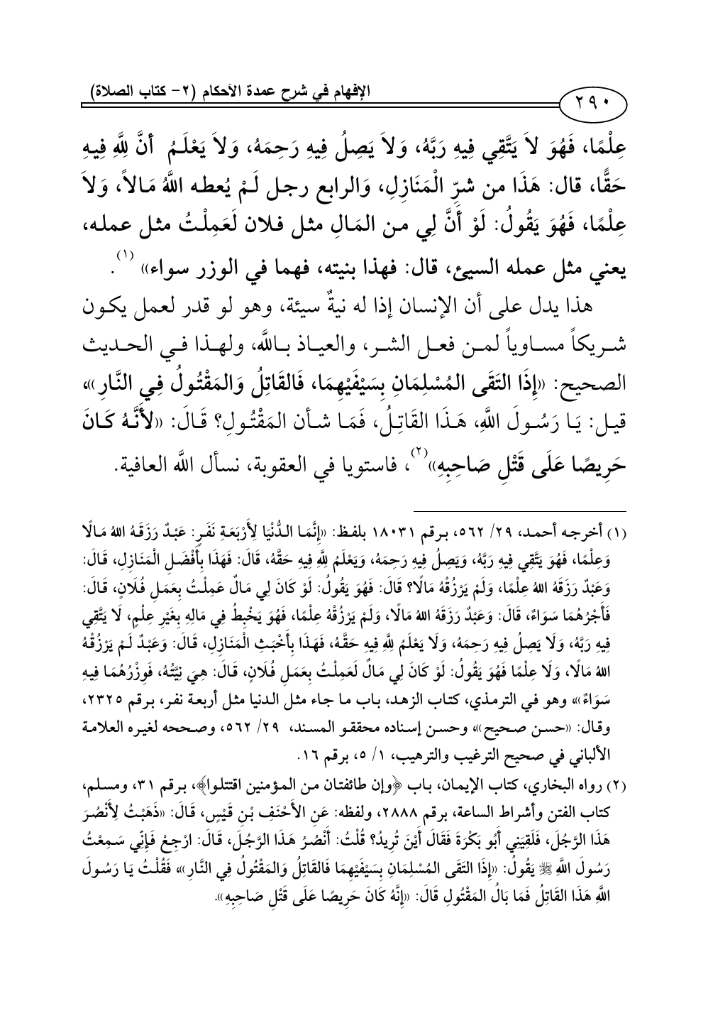 (¬1) أخرجه أحمد، 29/ 562، برقم 18031 بلفظ: «إِنَّمَا الدُّنْيَا لِأَرْبَعَةِ نَفَرٍ: عَبْدٌ رَزَقَهُ اللهُ مَالًا وَعِلْمًا، فَهُوَ يَتَّقِي فِيهِ رَبَّهُ، وَيَصِلُ فِيهِ رَحِمَهُ، وَيَعْلَمُ لِلَّهِ فِيهِ حَقَّهُ، قَالَ: فَهَذَا بِأَفْضَلِ الْمَنَازِلِ، قَالَ: وَعَبْدٌ رَزَقَهُ اللهُ عِلْمًا، وَلَمْ يَرْزُقْهُ مَالًا؟ قَالَ: فَهُوَ يَقُولُ: لَوْ كَانَ لِي مَالٌ عَمِلْتُ بِعَمَلِ فُلَانٍ، قَالَ: فَأَجْرُهُمَا سَوَاءٌ، قَالَ: وَعَبْدٌ رَزَقَهُ اللهُ مَالًا، وَلَمْ يَرْزُقْهُ عِلْمًا، فَهُوَ يَخْبِطُ فِي مَالِهِ بِغَيْرِ عِلْمٍ، لَا يَتَّقِي فِيهِ رَبَّهُ، وَلَا يَصِلُ فِيهِ رَحِمَهُ، وَلَا يَعْلَمُ لِلَّهِ فِيهِ حَقَّهُ، فَهَذَا بِأَخْبَثِ الْمَنَازِلِ، قَالَ: وَعَبْدٌ لَمْ يَرْزُقْهُ اللهُ مَالًا، وَلَا عِلْمًا فَهُوَ يَقُولُ: لَوْ كَانَ لِي مَالٌ لَعَمِلْتُ بِعَمَلِ فُلَانٍ، قَالَ: هِيَ نِيَّتُهُ، فَوِزْرُهُمَا فِيهِ سَوَاءٌ»، وهو في الترمذي، كتاب الزهد، باب ما جاء مثل الدنيا مثل أربعة نفر، برقم 2325، وقال: «حسن صحيح»، وحسن إسناده محققو المسند، 29/ 562، وصححه لغيره العلامة الألباني في صحيح الترغيب والترهيب، 1/ 5، برقم 16.
