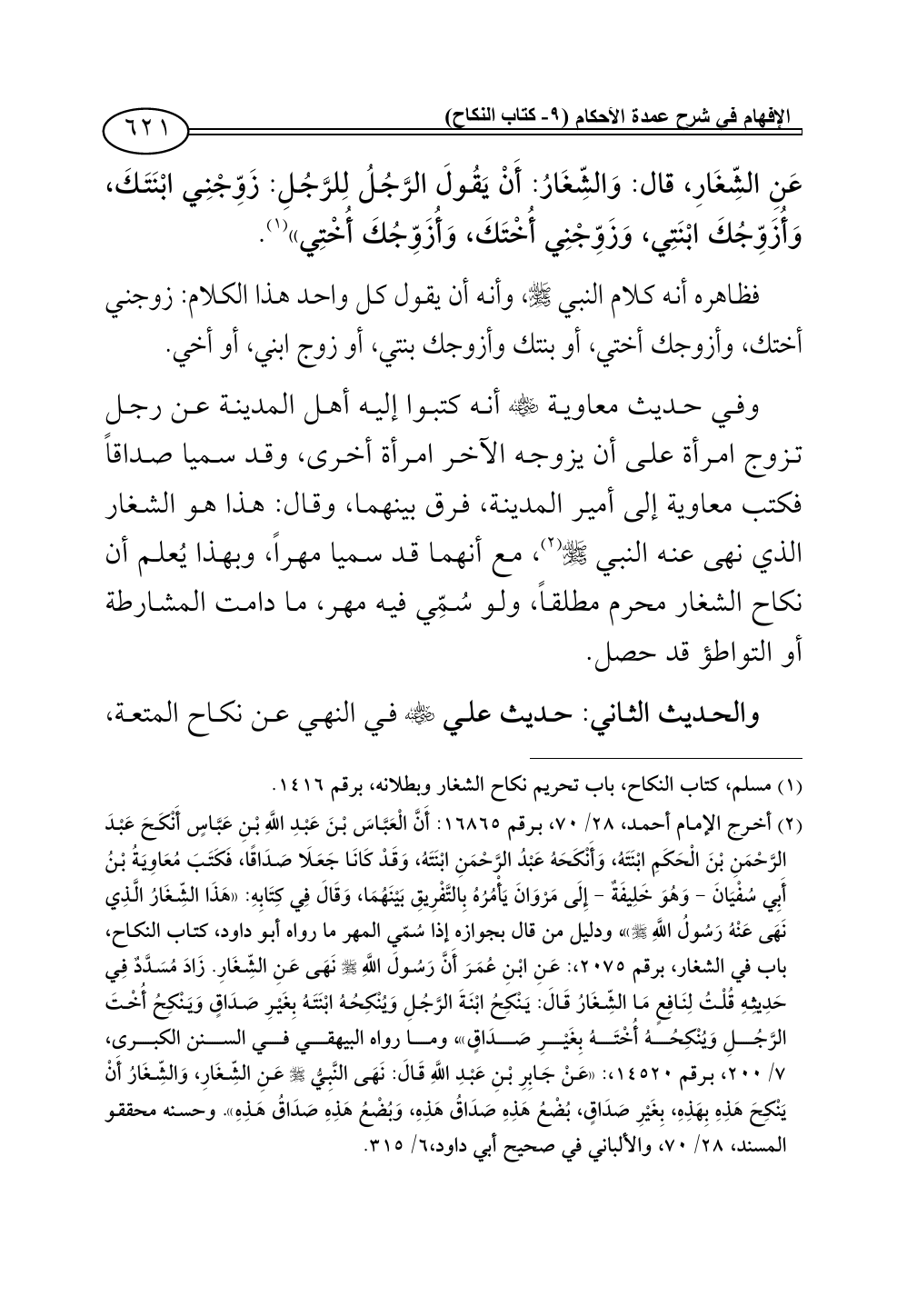 (¬2) أخرج الإمام أحمد، 28/ 70، برقم 16865: أَنَّ الْعَبَّاسَ بْنَ عَبْدِ اللَّهِ بْنِ عَبَّاسٍ أَنْكَحَ عَبْدَ الرَّحْمَنِ بْنَ الْحَكَمِ ابْنَتَهُ، وَأَنْكَحَهُ عَبْدُ الرَّحْمَنِ ابْنَتَهُ، وَقَدْ كَانَا جَعَلَا صَدَاقًا، فَكَتَبَ مُعَاوِيَةُ بْنُ أَبِي سُفْيَانَ - وَهُوَ خَلِيفَةٌ - إِلَى مَرْوَانَ يَامُرُهُ بِالتَّفْرِيقِ بَيْنَهُمَا، وَقَالَ فِي كِتَابِهِ: «هَذَا الشِّغَارُ الَّذِي نَهَى عَنْهُ رَسُولُ اللَّهِ - صلى الله عليه وسلم -»، ودليل من قال بجوازه إذا سُمّي المهر ما رواه أبو داود، كتاب النكاح، باب في الشغار، برقم 2075،: عَنِ ابْنِ عُمَرَ أَنَّ رَسُولَ اللَّهِ - صلى الله عليه وسلم - نَهَى عَنِ الشِّغَارِ. زَادَ مُسَدَّدٌ فِي حَدِيثِهِ قُلْتُ لِنَافِعٍ مَا الشِّغَارُ قَالَ: يَنْكِحُ ابْنَةَ الرَّجُلِ وَيُنْكِحُهُ ابْنَتَهُ بِغَيْرِ صَدَاقٍ وَيَنْكِحُ أُخْتَ الرَّجُلِ وَيُنْكِحُهُ أُخْتَهُ بِغَيْرِ صَدَاقٍ»، وما رواه البيهقي في السنن الكبرى،