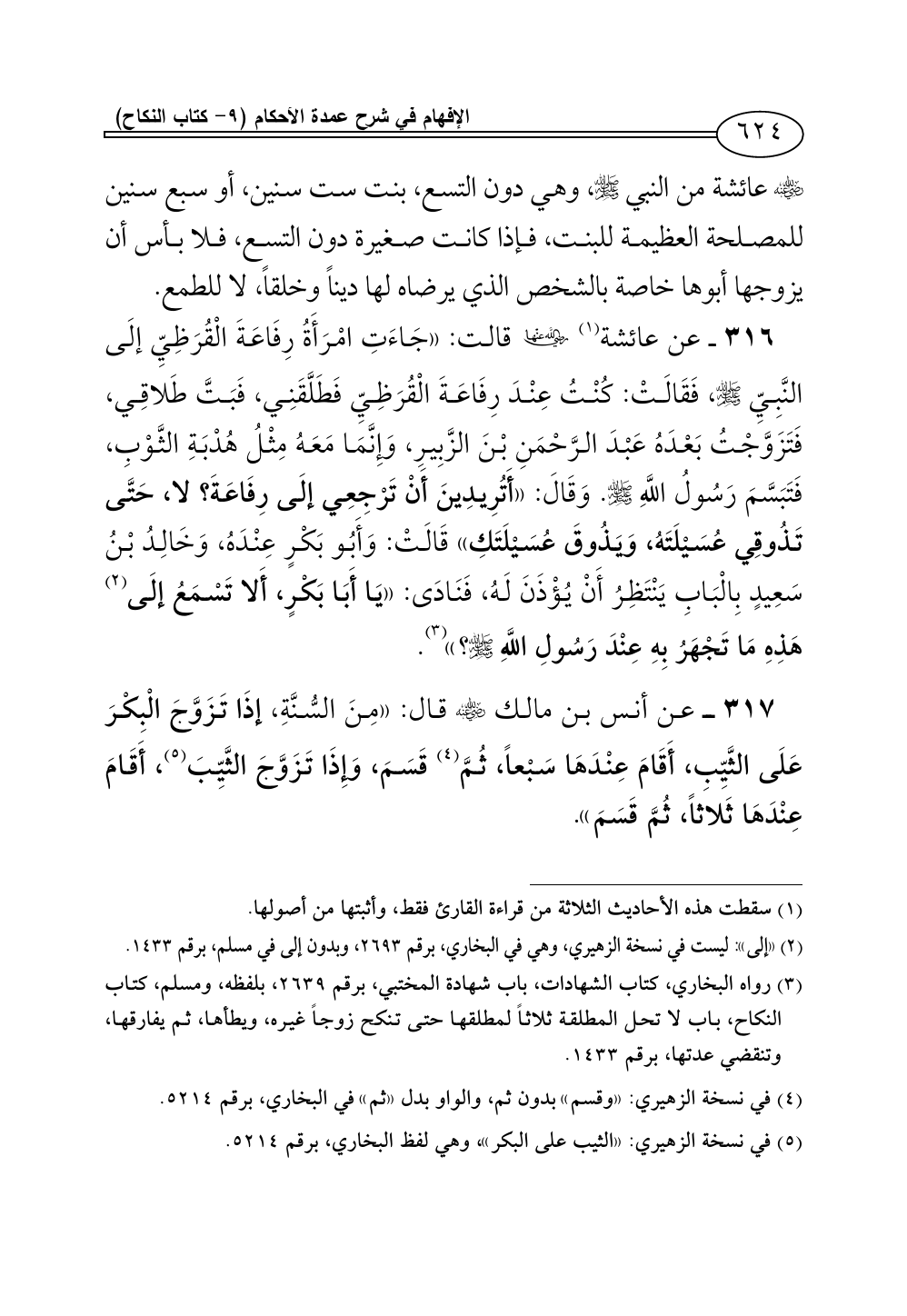 317 - عن أنس بن مالك - رضي الله عنه - قال: «مِنَ السُّنَّةِ، إذَا تَزَوَّجَ الْبِكْرَ عَلَى الثَّيِّبِ، أَقَامَ عِنْدَهَا سَبْعاً، ثُمَّ (¬4) قَسَمَ، وَإِذَا تَزَوَّجَ الثَّيِّبَ (¬5)، أَقَامَ عِنْدَهَا ثَلاثاً، ثُمَّ قَسَمَ».