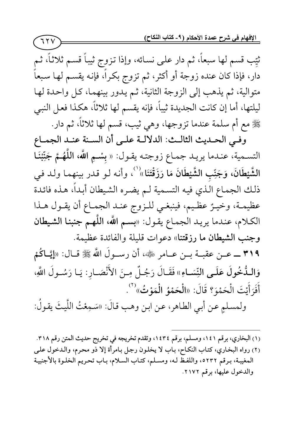 وفي الحديث الثالث: الدلالة على أن السنة عند الجماع التسمية، عندما يريد جماع زوجته يقول: «بِسْمِ اللَّه، اللَّهُمَّ جَنِّبْنَا الشَّيْطَانَ، وَجَنِّبِ الشَّيْطَانَ مَا رَزَقْتَنَا» (¬1)، وأنه لو قدر بينهما ولد في ذلك الجماع الذي فيه التسمية لم يضره الشيطان أبداً، هذه فائدة عظيمة، وخيرٌ عظيم، فينبغي للزوج عند الجماع أن يقول هذا الكلام، عندما يريد الجماع يقول: «بسم اللَّه، اللَّهم جنبنا الشيطان وجنب الشيطان ما رزقتنا» دعوات قليلة والفائدة عظيمة.