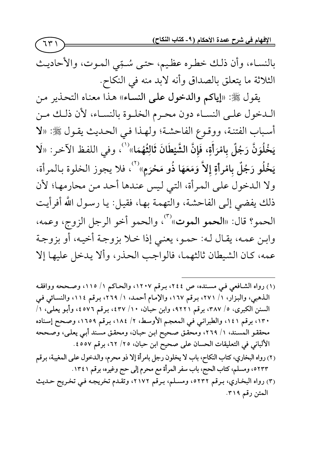 (¬2) رواه البخاري، كتاب النكاح، باب لا يخلون رجل بامرأة إلا ذو محرم، والدخول على المغيبة، برقم 5233، ومسلم، كتاب الحج، باب سفر المرأة مع محرم إلى حج وغيره، برقم 1341.
