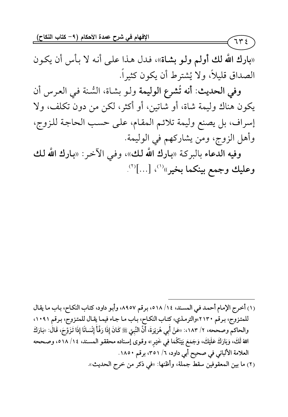 (¬1) أخرج الإمام أحمد في المسند، 14/ 518، برقم 8957، وأبو داود، كتاب النكاح، باب ما يقال للمتزوج، برقم 2130،والترمذي، كتاب النكاح، باب ما جاء فيما يقال للمتزوج، برقم 1091، والحاكم وصححه، 2/ 183،: «عَنْ أَبِي هُرَيْرَةَ، أَنَّ النَّبِيَّ - صلى الله عليه وسلم - كَانَ إِذَا رَفَّأَ إِنْسَانًا إِذَا تَزَوَّجَ، قَالَ: «بَارَكَ اللهُ لَكَ، وَبَارَكَ عَلَيْكَ، وَجَمَعَ بَيْنَكُمَا فِي خَيْرٍ»، وقوى إسناده محققو المسند، 14/ 518، وصححه العلامة الألباني في صحيح أبي داود، 6/ 351، برقم 1850.