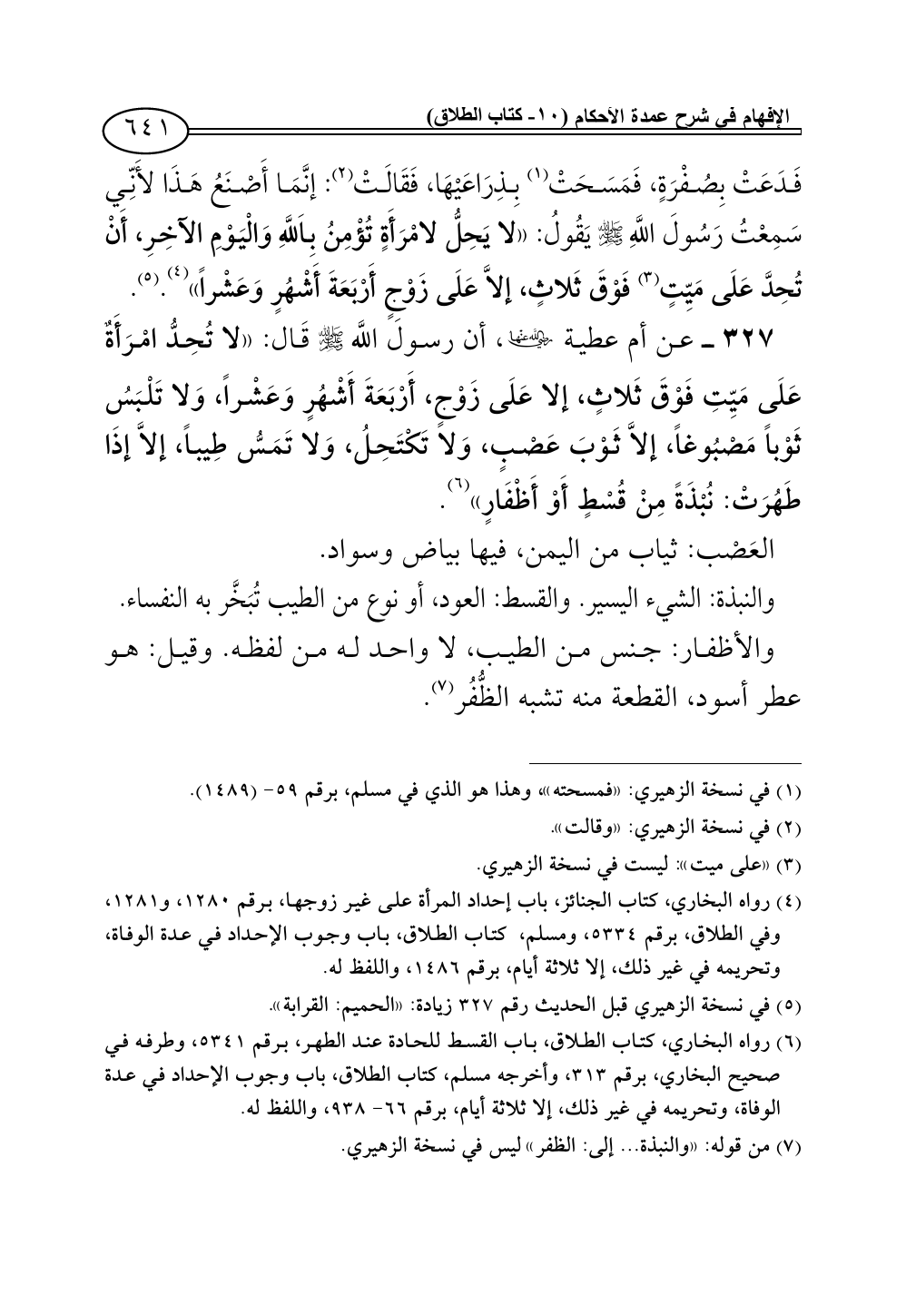 327 - عن أم عطية - رضي الله عنها -، أن رسولَ اللَّه - صلى الله عليه وسلم - قَال: «لا تُحِدُّ امْرَأَةٌ عَلَى مَيِّتِ فَوْقَ ثَلاثٍ، إلا عَلَى زَوْجٍ، أَرْبَعَةَ أَشْهُرٍ وَعَشْراً، وَلا تَلْبَسُ ثَوْباً مَصْبُوغاً، إلاَّ ثَوْبَ عَصْبٍ، وَلا تَكْتَحِلُ، وَلا تَمَسُّ طِيباً، إلاَّ إذَا طَهُرَتْ: نُبْذَةً مِنْ قُسْطٍ أَوْ أَظْفَارٍ» (¬6).