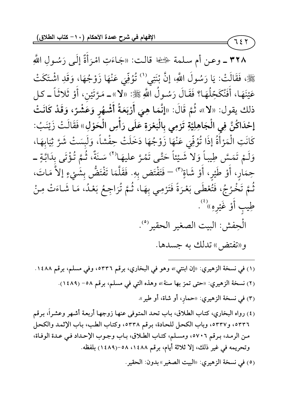 328 - وعن أم سلمة - رضي الله عنها - قالت: «جَاءَتِ امْرَأَةٌ إلَى رَسُولِ اللَّهِ - صلى الله عليه وسلم -، فَقَالَتْ: يَا رَسُولَ اللَّهِ، إنَّ بْنَتِي (¬1) تُوُفِّيَ عَنْهَا زَوْجُهَا، وَقَدِ اشْتَكَتْ عَيْنَهَا، أَفَنُكَحِّلُهَا؟ فَقَالَ رَسُولُ اللَّهِ - صلى الله عليه وسلم -: «لا» ــ مَرَّتَيْنِ، أَوْ ثَلاثَاً ــ كل ذلك يقول: «لا»، ثُمَّ قَالَ: «إنَّمَا هِيَ أَرْبَعَةُ أَشْهُرٍ وَعَشْرٌ، وَقَدْ كَانَتْ إحْدَاكُنَّ فِي الْجَاهِلِيَّةِ تَرْمِي بِالْبَعْرَةِ عَلَى رَاسِ الْحَوْلِ» فَقَالَتْ زَيْنَبُ: كَانَتِ الْمَرْأَةُ إذَا تُوُفِّيَ عَنْهَا زَوْجُهَا دَخَلَتْ حِفْشاً، وَلَبِسَتْ شَرَّ ثِيَابِهَا، وَلَمْ تَمَسَّ طِيباً وَلا شَيْئاً حَتَّى تَمُرَّ عليهَا (¬2) سَنَةٌ، ثُمَّ تُؤْتَى بِدَابَّةٍ ــ حِمَارٍ، أَوْ طَيْرٍ، أَوْ شَاةٍ (¬3) - فَتَفْتَض بِهِ. فَقَلَّمَا تَفْتَضُّ بِشَيْءٍ إلاَّ مَاتَ، ثُمَّ تَخْرُجُ، فَتُعْطَى بَعْرَةً فَتَرْمِي بِهَا، ثُمَّ تُرَاجِعُ بَعْدُ، مَا شَاءَتْ مِنْ طِيبٍ أَوْ غَيْرِهِ» (¬4).