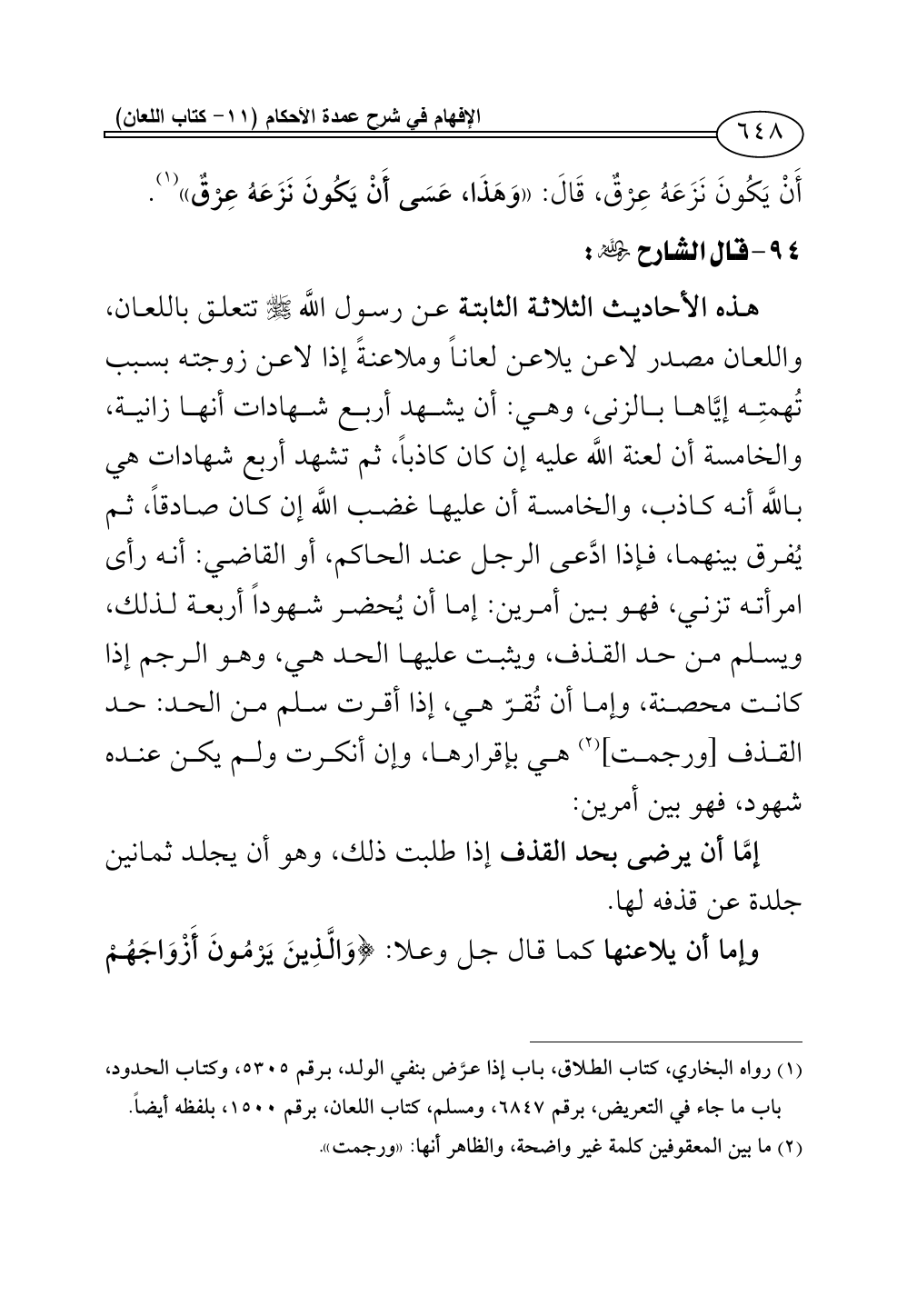 هذه الأحاديث الثلاثة الثابتة عن رسول اللَّه - صلى الله عليه وسلم - تتعلق باللعان، واللعان مصدر لاعن يلاعن لعاناً وملاعنةً إذا لاعن زوجته بسبب تُهمتِه إيَّاها بالزنى، وهي: أن يشهد أربع شهادات أنها زانية، والخامسة أن لعنة اللَّه عليه إن كان كاذباً، ثم تشهد أربع شهادات هي باللَّه أنه كاذب، والخامسة أن عليها غضب اللَّه إن كان صادقاً، ثم يُفرق بينهما، فإذا ادَّعى الرجل عند الحاكم، أو القاضي: أنه رأى امرأته تزني، فهو بين أمرين: إما أن يُحضر شهوداً أربعة لذلك، ويسلم من حد القذف، ويثبت عليها الحد هي، وهو الرجم إذا كانت محصنة، وإما أن تُقرّ هي، إذا أقرت سلم من الحد: حد القذف [ورجمت] (¬2) هي بإقرارها، وإن أنكرت ولم يكن عنده شهود، فهو بين أمرين: