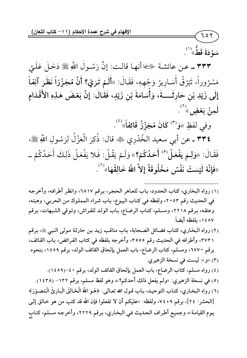 333 - عن عائشة لأنها قالت: إنَّ رَسُولَ اللَّهِ - صلى الله عليه وسلم - دَخَلَ عَلَيَّ مَسْرُوراً، تَبْرُقُ أَسَارِيرُ وَجْهِهِ، فَقَالَ: «أَلَمْ تَرَيْ؟ أَنَّ مُجَزِّزاً نَظَرَ آنِفاً إلَى زَيْدِ بْنِ حَارِثَةَ، وَأُسَامَةَ بْنِ زَيْدٍ، فَقَالَ: إنَّ بَعْضَ هَذِهِ الأَقْدَامِ لَمِنْ بَعْضٍ» (¬3).