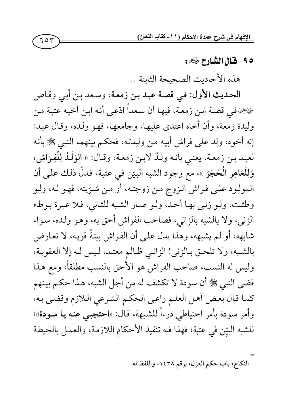 الحديث الأول: في قصة عبد بن زمعة، وسعد بن أبي وقاص بفي قصة ابن زمعة، فيها أن سعداً ادّعى أنه ابن أخيه عتبة من وليدة زمعة، وأن أخاه اعتدى عليها، وجامعها، فهو ولده, وقال عبد: إنه أخوه، ولد على فراش أبيه من وليدته، فحكم بينهما النبي - صلى الله عليه وسلم - بأنه لعبد بن زمعة، يعني بأنه ولدٌ لابن زمعة، وقال: «الْوَلَدُ لِلْفِرَاشِ، وَلِلْعَاهِرِ الْحَجَرُ»، مع وجود الشبه البيّن في عتبة، فدلّ ذلك على أن المولود على فراش الزوج من زوجته، أو من سُرّيته، فهو له، ولو وطئت، ولو زنى بها أحد، ولو صار الشبه للثاني، فلا عبرة بوطء الزنى، ولا بالشبه بالزاني، فصاحب الفراش أحق به، وهو ولده، سواء شابهه، أو لم يشبهه، وهذا يدل على أن الفراش بينةٌ قوية، لا تعارض بالشبه، ولا تلحق بالزنى! الزاني ظالم معتد، ليس له إلا العقوبة، وليس له النسب، صاحب الفراش هو الأحق بالنسب مطلقاً، ومع هذا قضى النبي - صلى الله عليه وسلم - أن سودة لا تكشف له من أجل الشبه، هذا حكم بينهم كما قال بعض أهل العلم راعى الحكم الشرعي اللازم وقضى به، وأمر سودة بأمر احتياطي درءاً للشبهة، قال: «احتجبي عنه يا سودة»؛ للشبه البيِّن في عتبة؛ فهذا فيه تنفيذ الأحكام اللازمة، والعمل بالحيطة