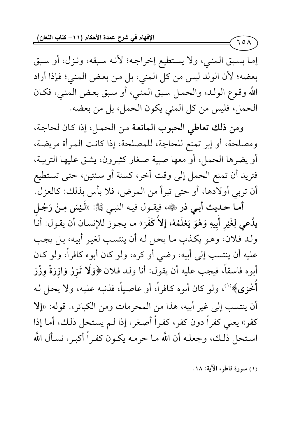 أما حديث أبي ذر - رضي الله عنه -، فيقول فيه النبي - صلى الله عليه وسلم -: «لَيْسَ مِنْ رَجُلٍ يدَّعي لِغَيْرِ أَبِيهِ وَهُوَ يَعْلَمُهُ، إلاَّ كَفَرَ» ما يجوز للإنسان أن يقول: أنا ولد فلان، وهو يكذب ما يحل له أن ينتسب لغير أبيه، بل يجب عليه أن ينتسب إلى أبيه، رضي أو كره، ولو كان أبوه كافراً، ولو كان أبوه فاسقاً، فيجب عليه أن يقول: أنا ولد فلان {وَلَا تَزِرُ وَازِرَةٌ وِزْرَ أُخْرَى} (¬1)، ولو كان أبوه كافراً، أو عاصياً، فذنبه عليه، ولا يحل له أن ينتسب إلى غير أبيه، هذا من المحرمات ومن الكبائر،. قوله: «إلا كفر» يعني كفراً دون كفر، كفراً أصغر، إذا لم يستحل ذلك، أما إذا استحل ذلك، وجعله أن اللَّه ما حرمه يكون كفراً أكبر، نسأل اللَّه