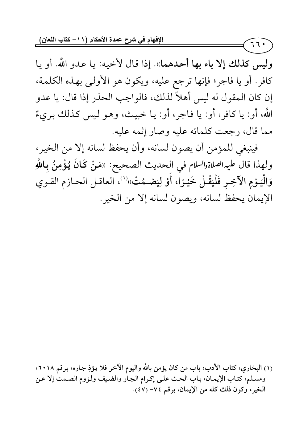 وليس كذلك إلا باء بها أحدهما». إذا قال لأخيه: يا عدو اللَّه. أو يا كافر. أو يا فاجر؛ فإنها ترجع عليه، ويكون هو الأولى بهذه الكلمة، إن كان المقول له ليس أهلاً لذلك، فالواجب الحذر إذا قال: يا عدو اللَّه، أو: يا كافر، أو: يا فاجر، أو: يا خبيث، وهو ليس كذلك بريءٌ مما قال، رجعت كلماته عليه وصار إثمه عليه.