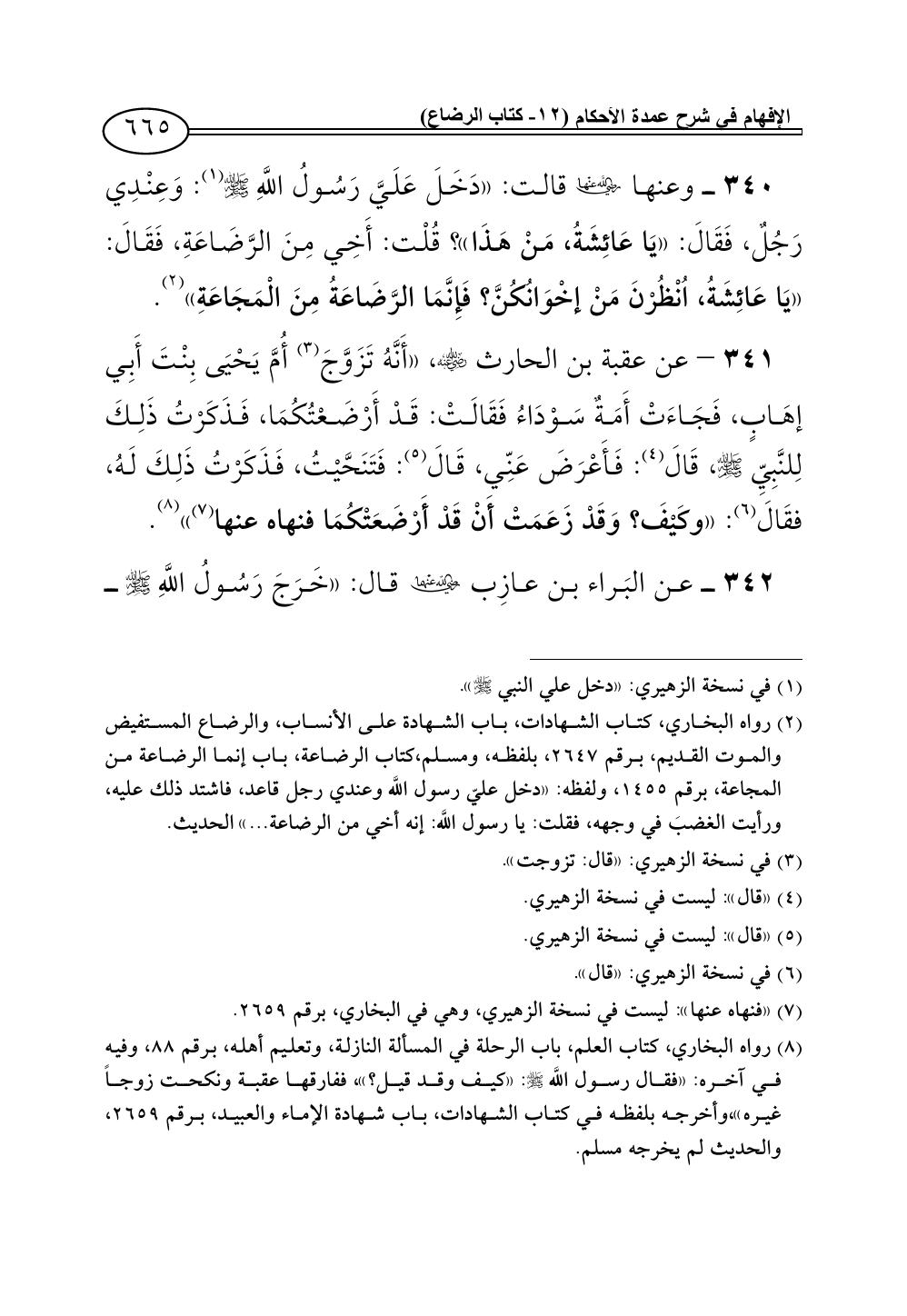 341 - عن عقبة بن الحارث - رضي الله عنه -، «أَنَّهُ تَزَوَّجَ (¬3) أُمَّ يَحْيَى بِنْتَ أَبِي إهَابٍ، فَجَاءَتْ أَمَةٌ سَوْدَاءُ فَقَالَتْ: قَدْ أَرْضَعْتُكُمَا، فَذَكَرْتُ ذَلِكَ لِلنَّبِيِّ - صلى الله عليه وسلم -، قَالَ (¬4): فَأَعْرَضَ عَنِّي، قَالَ (¬5): فَتَنَحَّيْتُ، فَذَكَرْتُ ذَلِكَ لَهُ، فقَالَ (¬6): «وكَيْفَ؟ وَقَدْ زَعَمَتْ أَنْ قَدْ أَرْضَعَتْكُمَا فنهاه عنها (¬7)» (¬8).